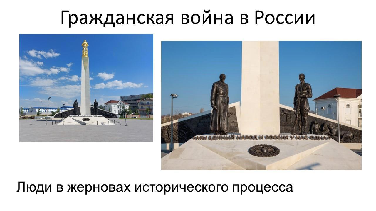 Моя центральная тема - Гражданская война в России. Для меня огромное значение имеет памятник, установленный в 2021 году в Севастополе. Его называют памятником примирению, потому что красноармеец и белогвардеец на нем стоят рядом - как части одного исторического процесса.