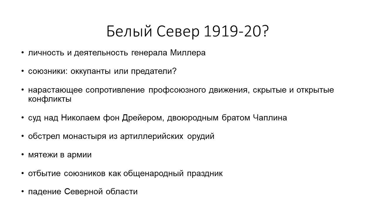 Моя первая книга в большей степени о красных, и следующую я решила писать о белых. Выбрала события на Севере по двум причинам. Во-первых, они совершенно потрясающие по своей драматургии. Эти события богаты на неожиданные союзы и коварные предательства, на ситуации, которые разрешались самым неожиданным образом. Во-вторых, потому что об этих событиях мало кто знает.