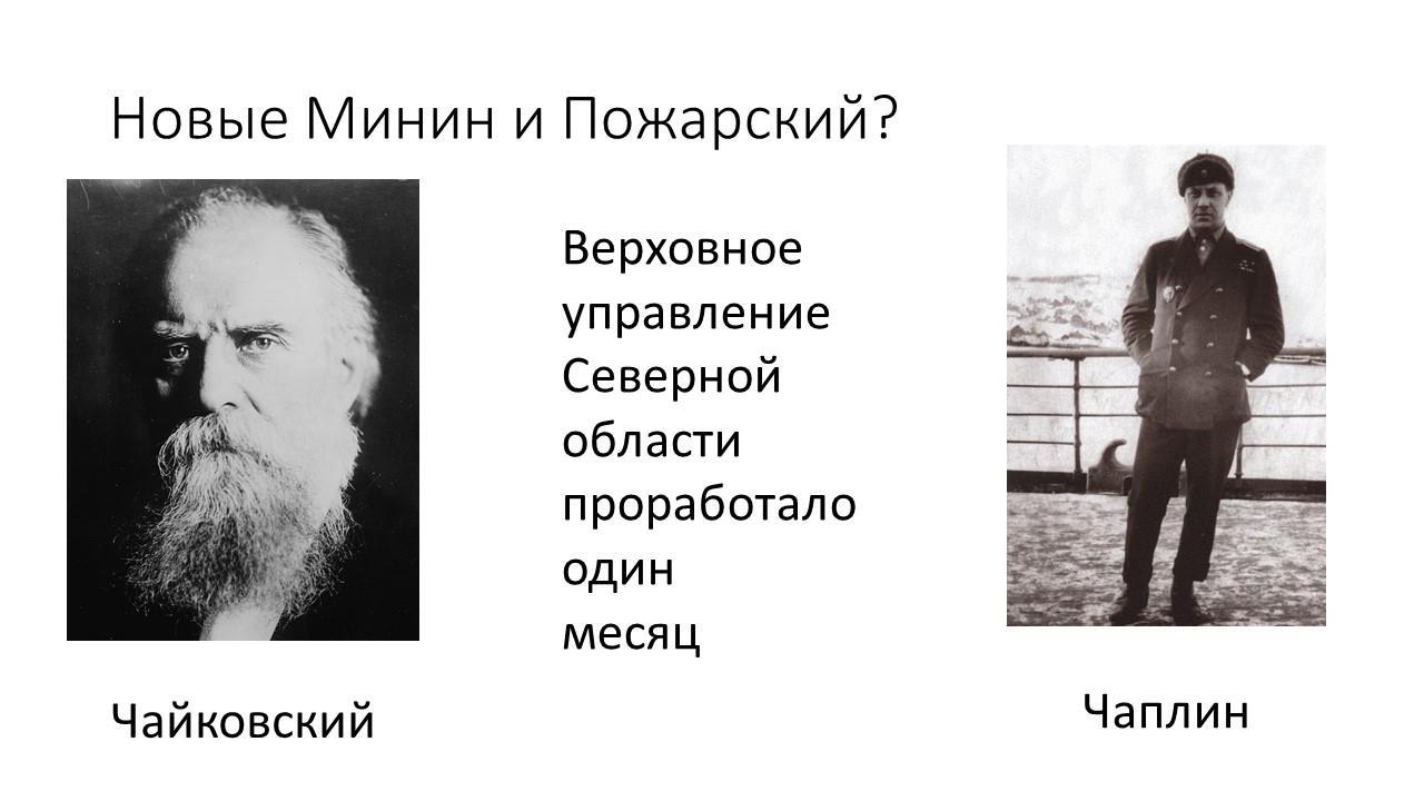 При этом они не могли найти общего языка с военными, которые и привели их к власти. Просуществовало оно один месяц. Через месяц военные под командованием человека с трагической биографией и комической фамилией Чаплин ночью ворвался в здание правительства, где его члены жили как коммуна, арестовал их всех, посадил на пароход и выслал на Соловки. Однако один из членов правительства бежал и отпечатал листовки, в которых говорилось, что офицеры хотят вернуть власть царя и тайно ввезли в город Михаила Романова (который был уже расстрелян к тому моменту). Город вспыхнул, всюду начались забастовки. Три дня трамвай водили американские солдаты. Иностранные дипломаты, почесав репу, отправили пароход на Соловки возвращать это правительство, какое-никакое. Чаплина отправили в ссылку.