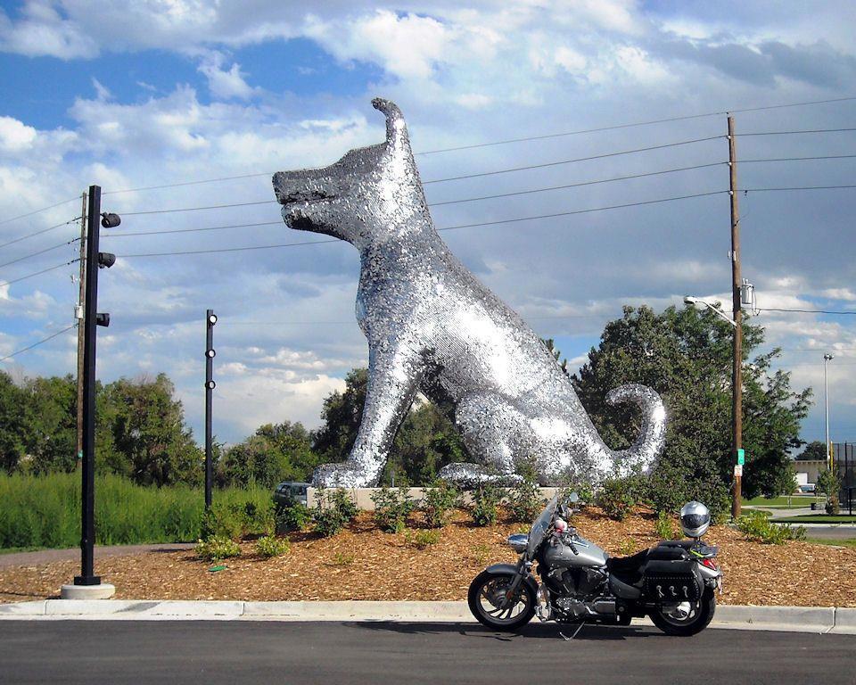 Установленная возле приюта для животных в Денвере собака высотой в 7 метров блестит под Колорадским солнечным светом.