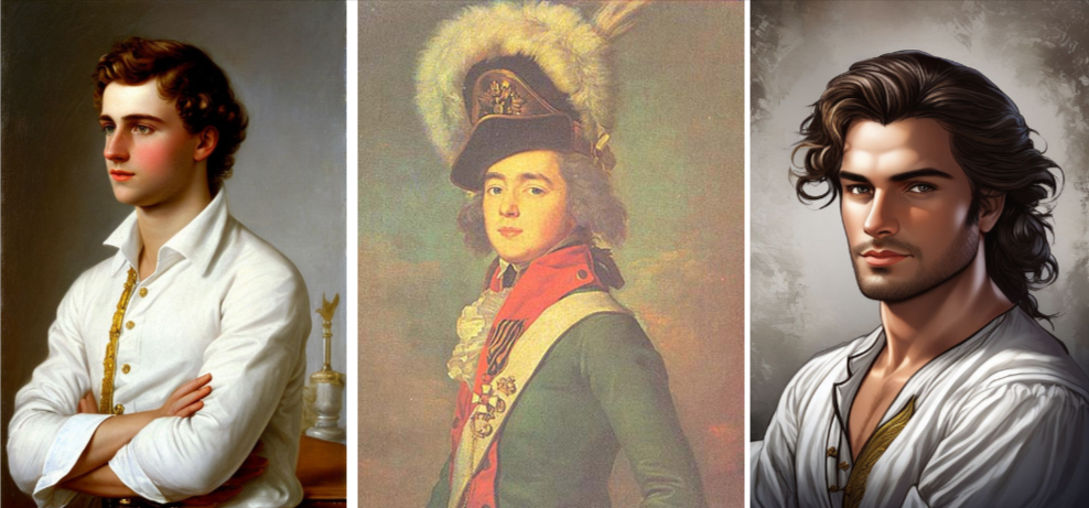 Ниже три картинки, которые у меня находятся в карточке главного героя "Забытого пути в Джаннатабад" князя Андрея Черноводова. Две из них - работа AI, одна реальный портрет той эпохи (думаю легко догадаться что есть что). На обложке (кстати, это тоже AI) князь получился гораздо более блондинистыми и глянцевым, но пусть для привлечения внимания пока останется таким