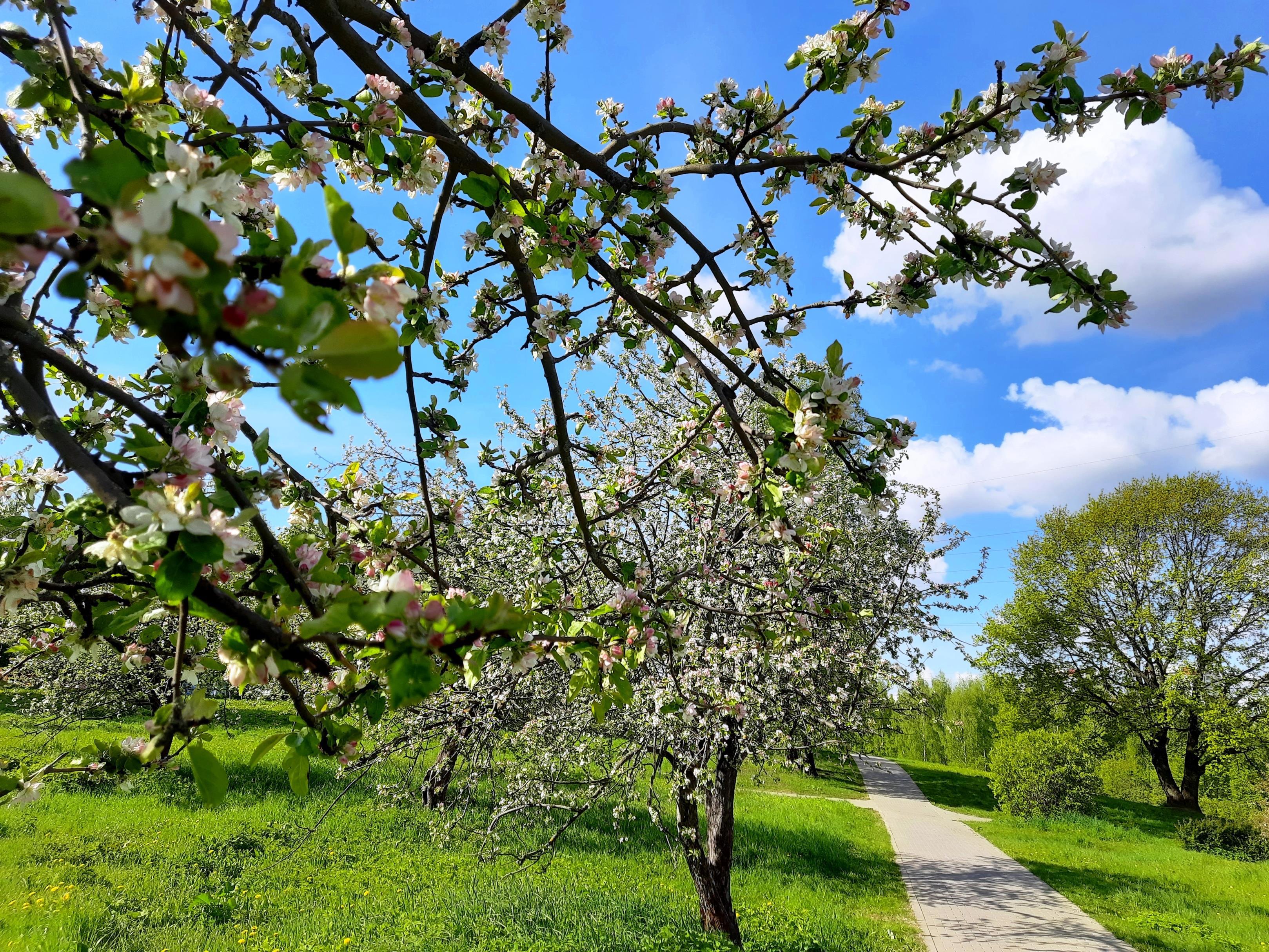 Фотографии цветов в парке. Яблоня, сирень, одуванчики