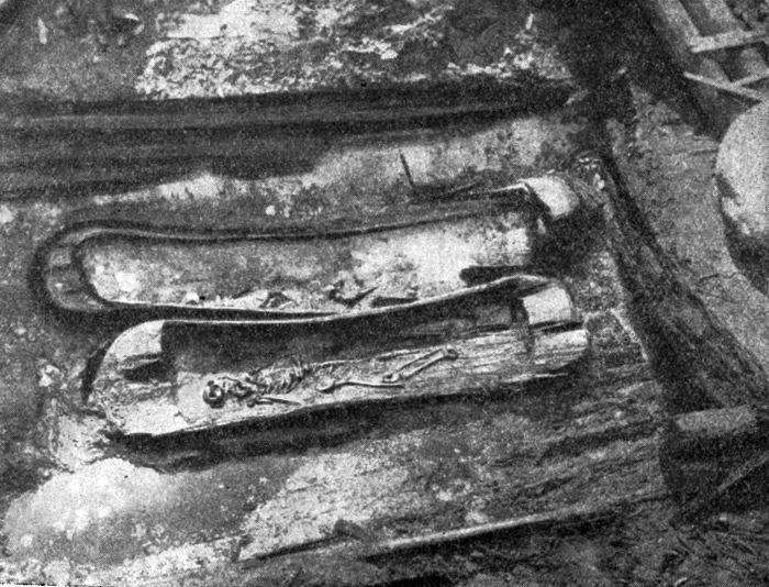 Ещё археологи отметили, что похожие захоронения они уже встречали. То есть концы погребальных колод были заострены, но этому не придавали значения – подумали, что это было связано со способом добычи дерева. Кстати, посмотрите на фото деревянных саркофагов с раскопок Пазырыкского кургана: