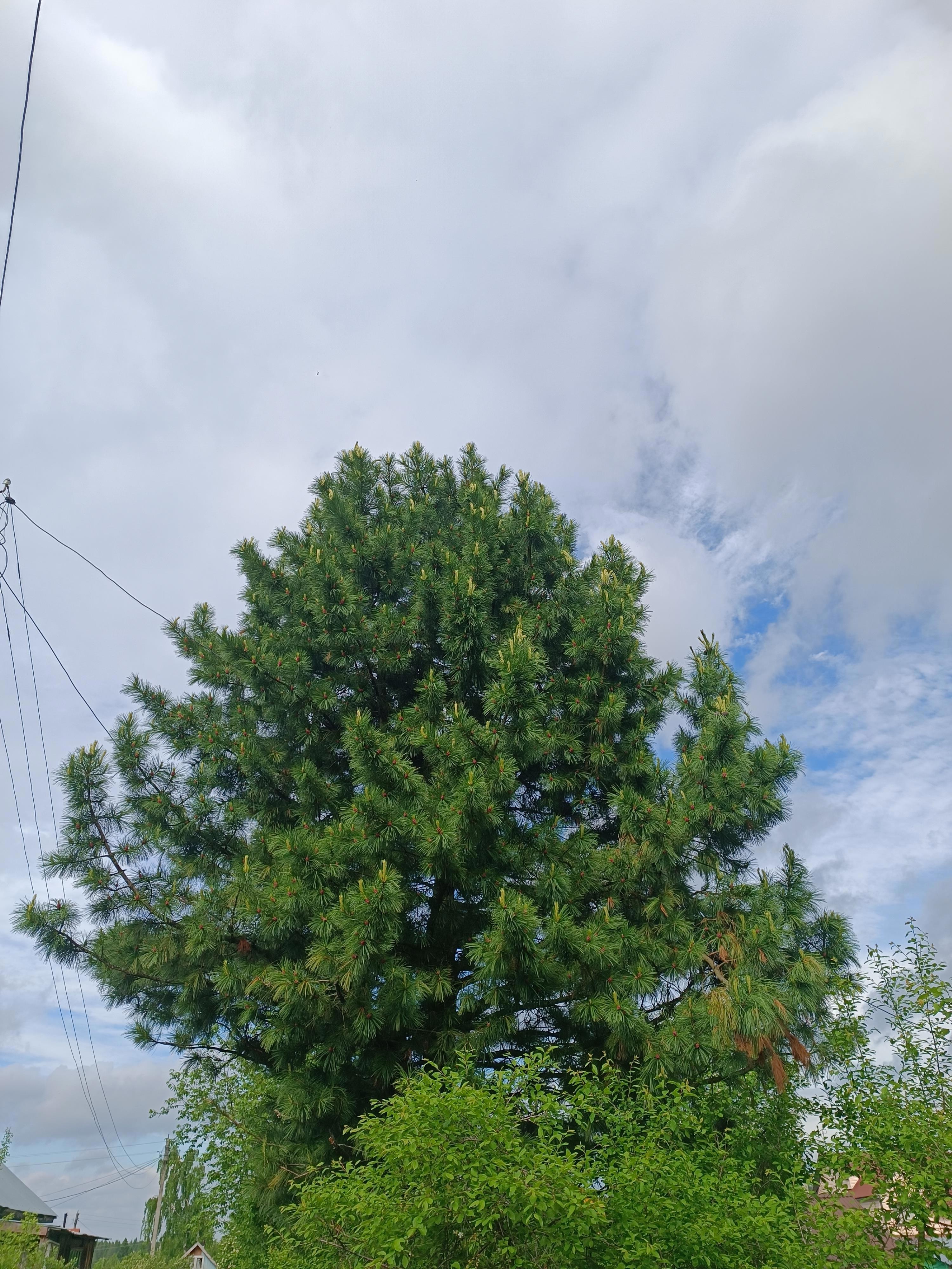 Соседский кедр великан. На нём живёт белка в гнезде. Она любит шоколадные конфеты. И грызёт кедровые орешки. Обычно осенью под кедром валяется несколько полностью вылущенных шишечек.