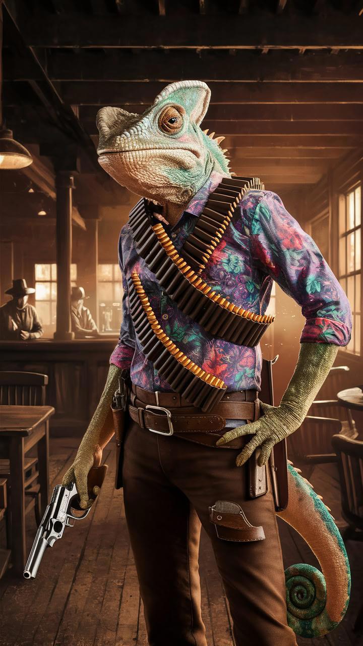 an anthropomorphic male chameleon gunslinger in a flowery shirt. wearing bandoliers filled with bullets and holding a revolver. rpg character concept, western . standing in a saloon