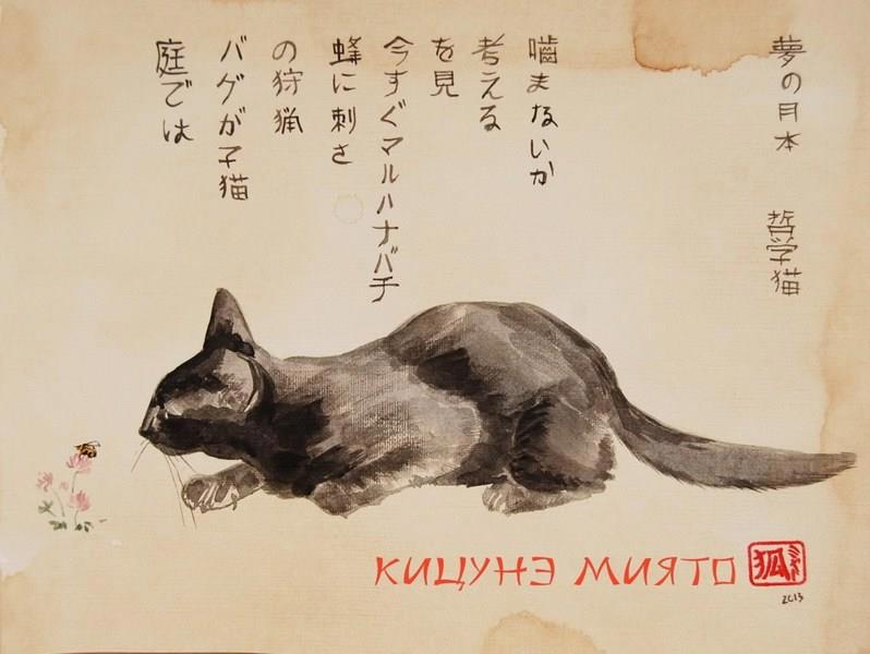 "Котик и пчёлка", бумага, тушь, акварель. Рылась в загашниках, нашла зарисовку котика с пчелой