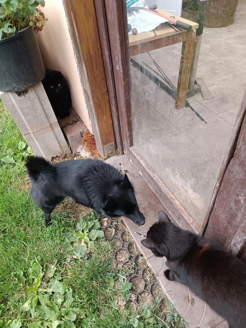 Встреча на нейтральной территории у задних дверей дома. Кошка засела за блоками. на которых стоят вёдра с клубникой, а собачка Шели здоровается с котом (у которого уже почти заросла шея, бурно облысевшая от противопаразитарного ошейника), Кот при приближении собаки зажмуривается и каменеет. собака сразу теряет к нему интерес. но с кошкой постоянно устраивают драки и погони кругалями по всему участку, тк кошка мимо собаки тоже спокойно пройти не может — обязательно зацепит ее когтями....