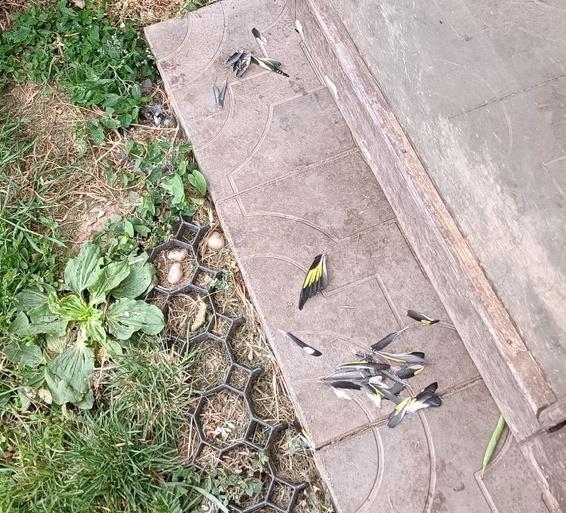 Кошки по причине продолжающегося бандитизма и массового уничтожения залетавших в стеклянную веранду воробьёв, были на лето выселены в беседку (на фоне задней стены которой сфотографирована роза). Воробьёв теперь не ловят. Перешли на синиц и их пёрушки регулярно раскладывают на пороге... Стервецы.
