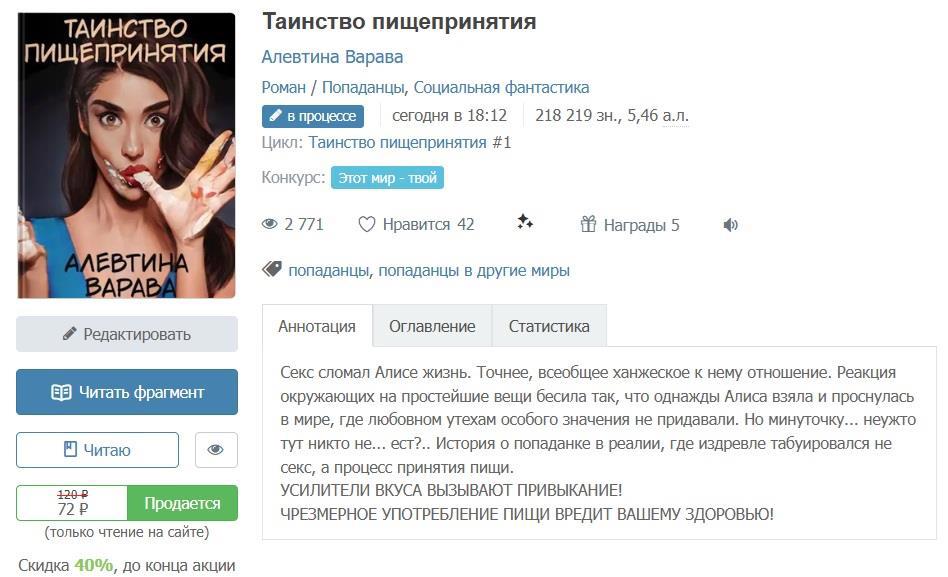 Автор: Алевтина ВараваМир, где потребление пищи - штука, интимная до неприличия. Где все носят закрывающие рты приспособления, а вкусовые добавки - строгое табу до 18 лет. Где сахар - легализованный наркотик, а алкоголь - запрещённый психотропный препарат с неприличным способом употребления. В такую реальность попала Алиса, которая только и хотела, чтобы её не подвергали осуждению за амурные дела. И да: в сексе в новом мире всё даже слишком разрешено. А всё потому, что в этом измерении много веков назад заправилы церкви сосредоточили своё внимание на чревоугодии, а не на блуде. Ведь именно вкушением запретного плода в райском саду Ева лишила людей Рая...