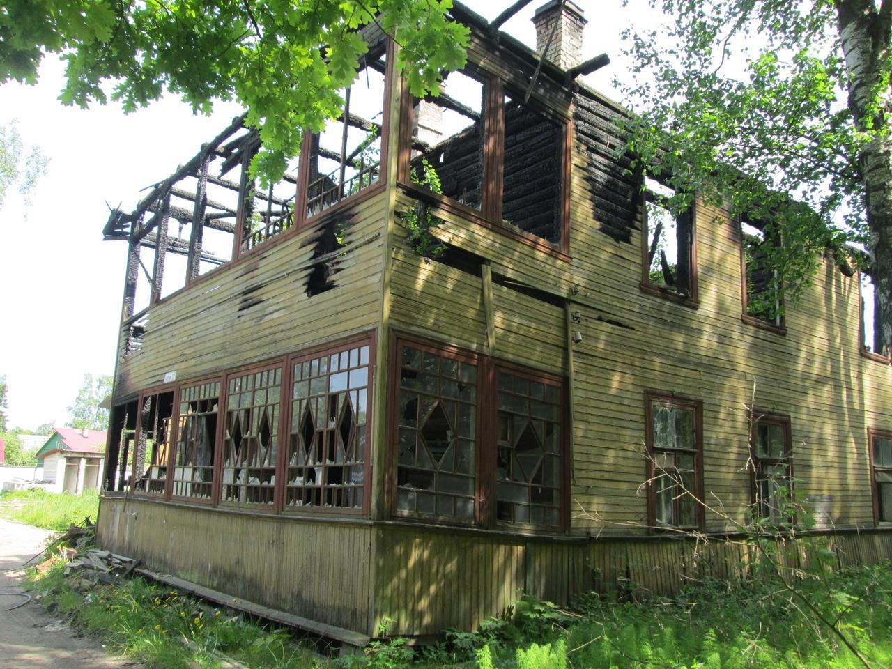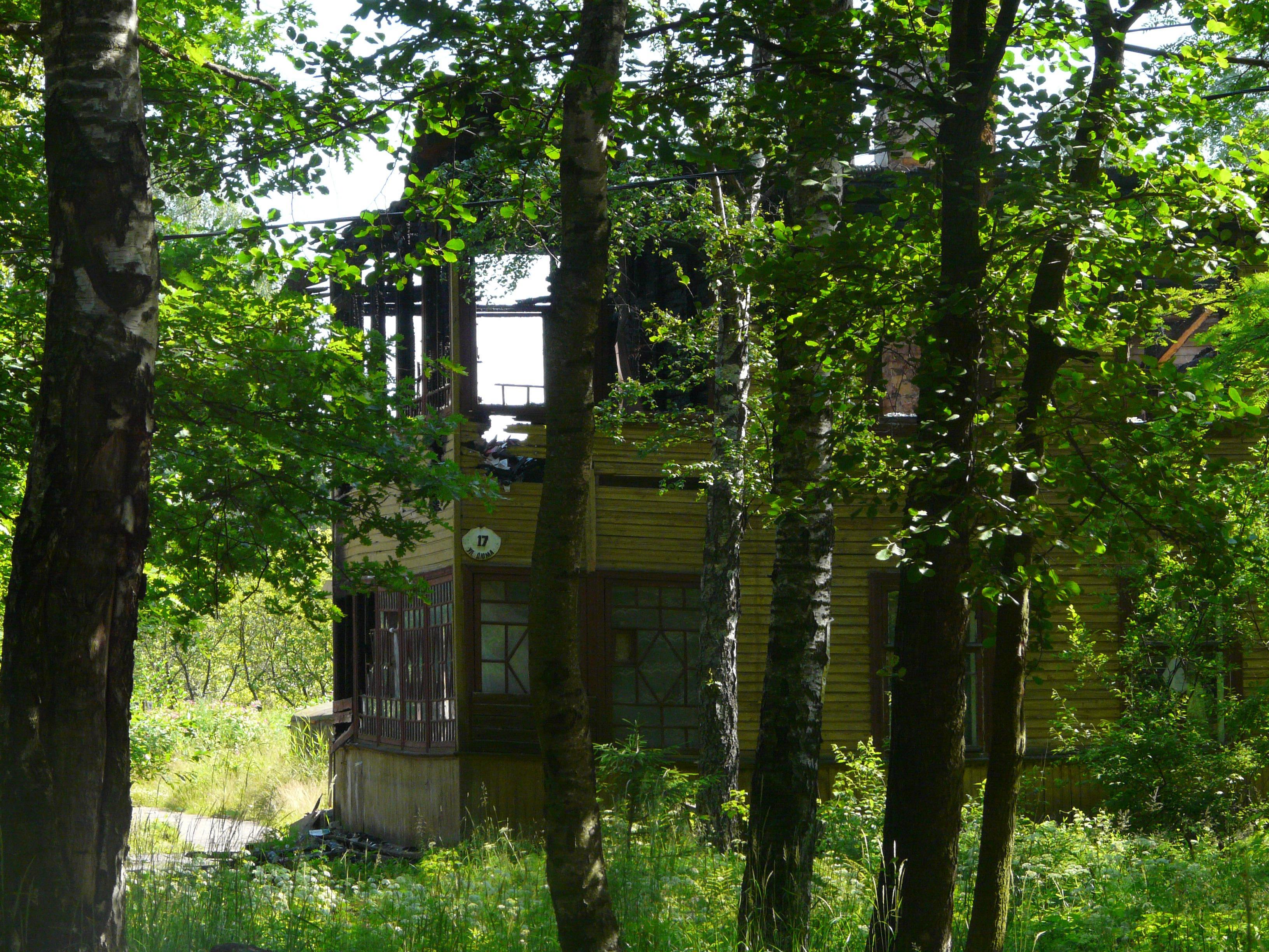Территория огорожена (видимо, кто-то выкупил), обгоревшие руины ещё стоят, но заросло всё напрочь (надо будет приехать по осени, посмотреть - заодно и в парк Сергиевка заглянуть).