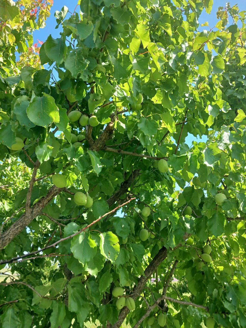Рядом с лиловым полем абрикосы. Но пока зеленые.