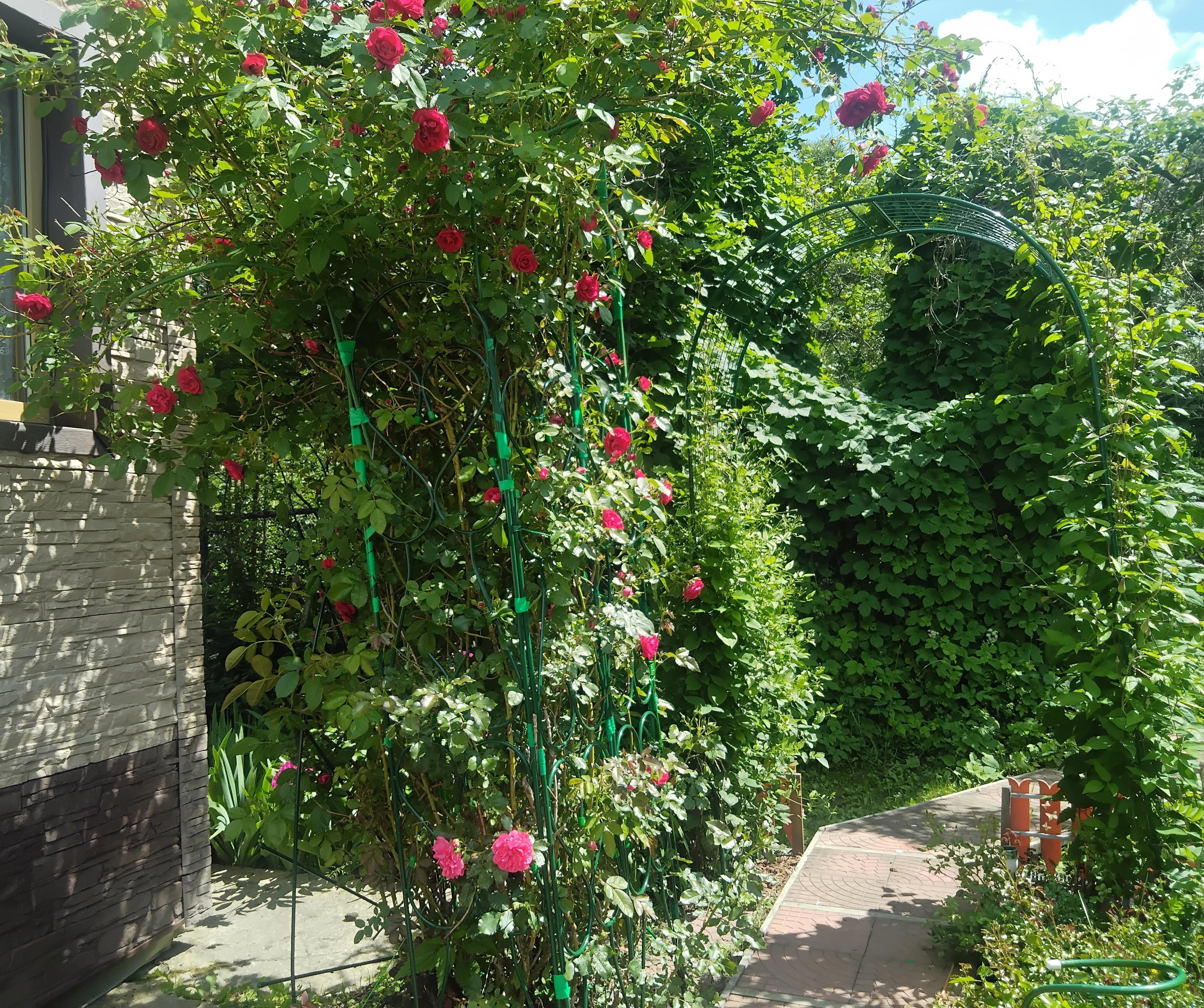 Роз у меня много, пятьдесят кустов, а, может, и больше, я их постоянно обновляю. Но есть одна, краса и гордость, визитная карточка нашего дачного участка. На ее цветение можно билеты продавать, как на какой-нибудь концерт. Это настоящее розовое дерево, сплошь усыпанное крупными цветками. Оттенок словами не передать, и не красные, и не малиновые, и не вишнёвые. Чудо природы, которое рождается каждый июнь на наших глаз. И мы садимся в качельки, сладко замираем и смотрим. Просто смотрим. Фото обязательно будет, пока только малая часть бутонов распустилась.