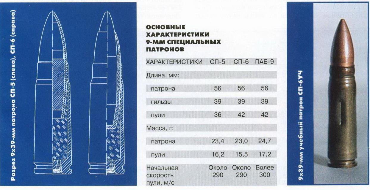 Новый патрон имел целый ряд преимуществ, но создать для него вариант с эффективной дозвуковой пулей было сложно – хотя соответствующие работы также проводились. Еще одним важным фактором стали новые требования военных к перспективным бесшумным комплексам – снайперскому и автоматному. С учетом развития средств индивидуальной защиты, от нового спец-автомата требовали поражение цели в бронежилете 3-его класса на дистанции 400 метров. Поскольку речь в любом случае шла о создании новых стрелковых комплексов, с 1984 года работы боеприпасников сосредоточились на создании двух видов дозвуковых патронов – снайперского и бронебойного.Снайперский вариант СП-5 был спроектирован Н. В. Забелиным, Л. С. Дворяниновой, а патрон повышенной пробиваемости СП-6 – Ю. З. Фроловым и Е. С. Корниловой. В 90-е к ним добавился более дешевый вариант ПАБ-9, а к изначальным ВСС "Винторез" и АС "ВАЛ" – еще целый ряд образцов стрелкового орудия: 9А-91, ВСК-94, ОЦ-14 "Гроза", СР-3 "Вихрь" и другие.