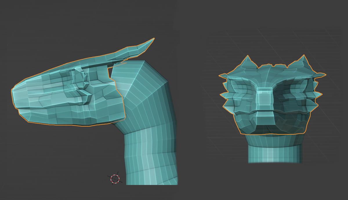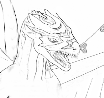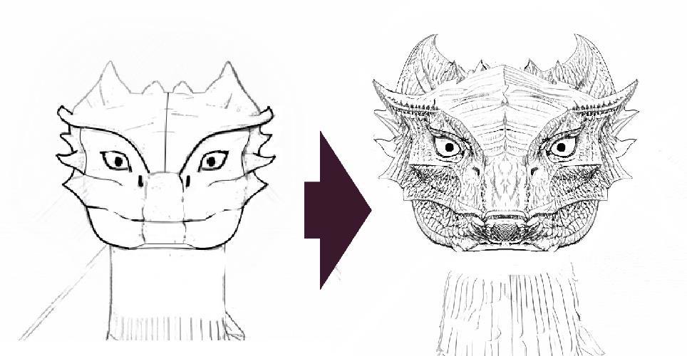 Похоже на классику. В профиль смотрится отлично, но как насчет вида в анфас? Тут начались проблемы (помнится даже видел забавный комикс от одного художника про «глупый вид» рептилиеобразных драконов.). Через множество часов получилось это: