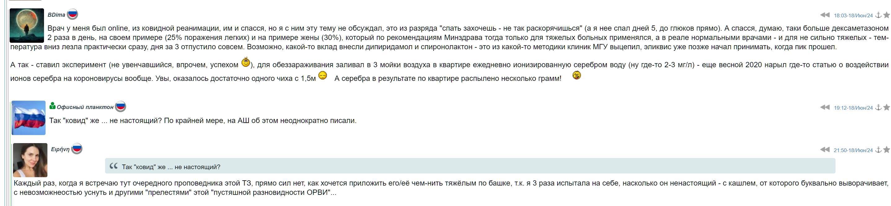 Меня в этом диалоге заинтересовало высказывание "Офисный планктон 19:12-18/Июн/24Так "ковид" же ... не настоящий? По крайней мере, на АШ об этом неоднократно писали."