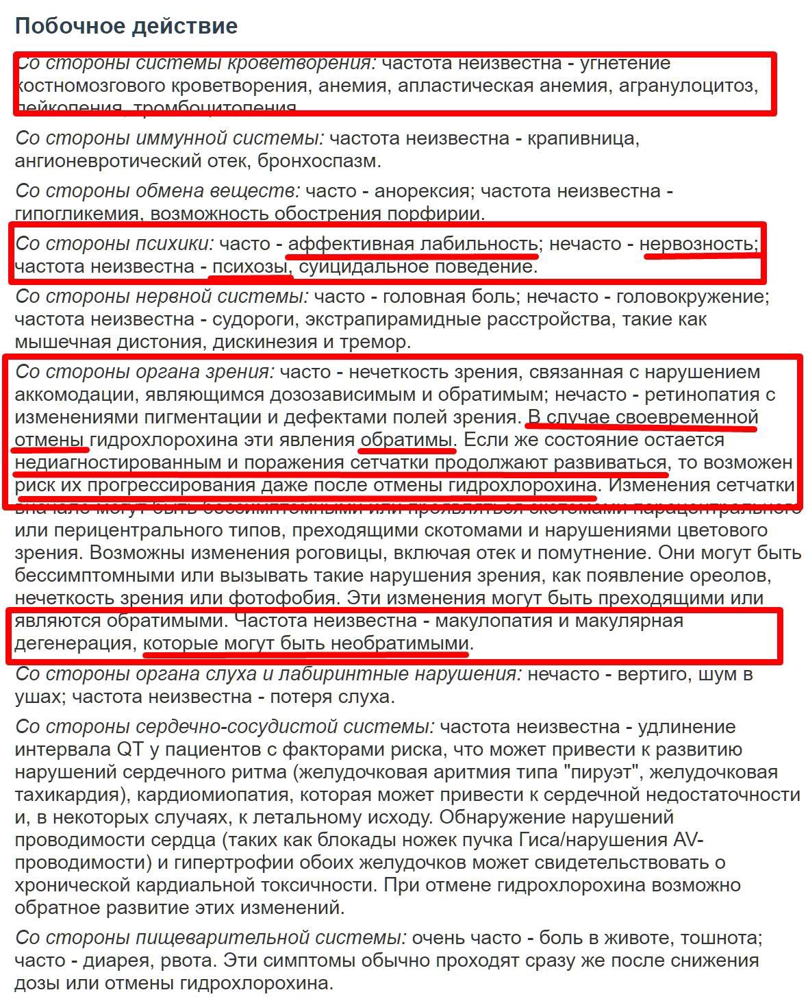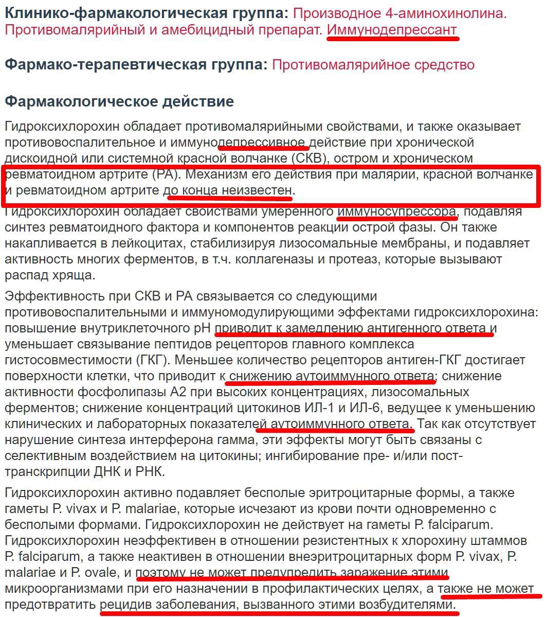 После начала заболевания и получения информации о заражённости модной болезнью ко мне прибыл адепт Нургла космонавт в скафандре, которого интересовало только согласие на слежку за моим перемещением с помощью цифровых устройств и установленных программ(но будучи ответственным я никуда не ходил - славься онлайн доставка!). Когда я отказался от подобного бреда меня больше никто не тревожил почти до самого последнего дня, когда у меня повторно провели тестирование. Надо сказать что это в корне различалось с тем, что было в августе того же года, когда мне названивали каждый день(больничный - обычная простуда с температурой) и некто с приятным женским голосом интересовался всё ли у меня в порядке - возможно почувствуй я недомогание в стиле ковида, то я смог услышать озабоченность моим здоровьем или на оборот радость от очередного клиента приносящего хорошие денежки, но так как у меня было всё хорошо, то я, так и не узнал как бы изменилось эмоциональное наполнение этого приятного молодого женского голоса. Теперь что касается лечения: мне было выписано множество препаратов среди которых был один совершенно замечательный с не очень хорошо запоминающимся названием "Гидроксихлорохин" который применяют при лечении малярии, красной волчанки и ревматоидном артрите. Этого препарата мне выдали один блистер и распечатку инструкции в которой я обнаружил совершенно замечательные вещи, к сожалению по прошествии лет распечатка не сохранилась, но есть скриншот в котором я выделил наиболее интересное: