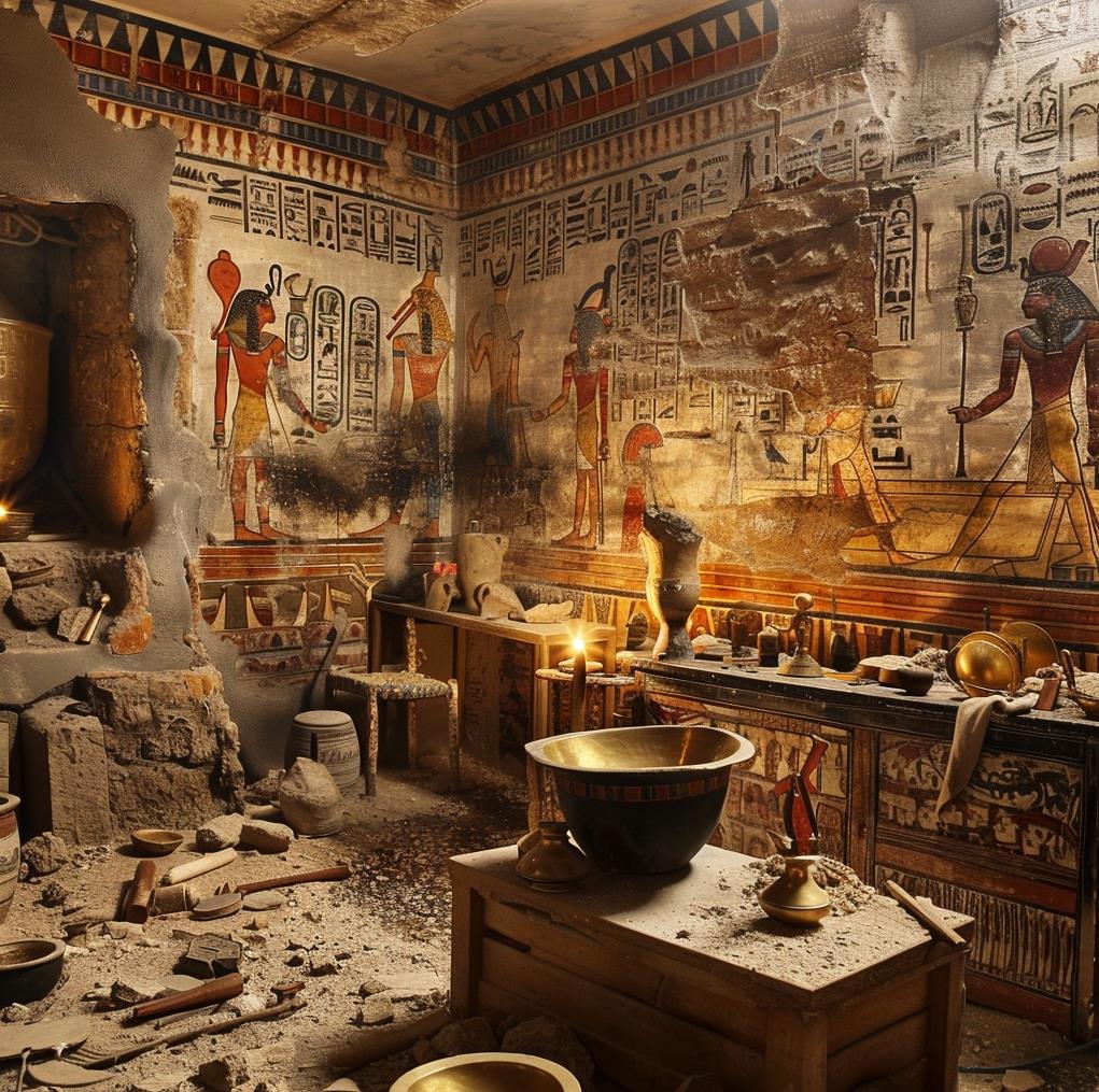 В следующей комнате, чуть меньшей по размеру, стены украшали уже не боги, а владельцы гробницы и бытовые сцены. Пол был усыпан фрагментами гробов, обломками погребальных пелен (Примечание: надо отметить, что процесс мумификации в Древнем царстве не был доведен до совершенства. Зачастую тело умащали различными благовониями, наполняли солью и заворачивали в ткань, пропитывая отвердевающими жидкостями. Бальзамировщики приглаживали слои материи так, чтобы придать максимальное сходство с живым телом. Получалось что-то похожее на человека с портретными чертами. Художники расписывали тканевую оболочку под живого человека. Тело внутри со временем разлагалось до скелета. Однако, такой чехол не был пластичным и при вандальном вскрытии разбивался на куски.)
