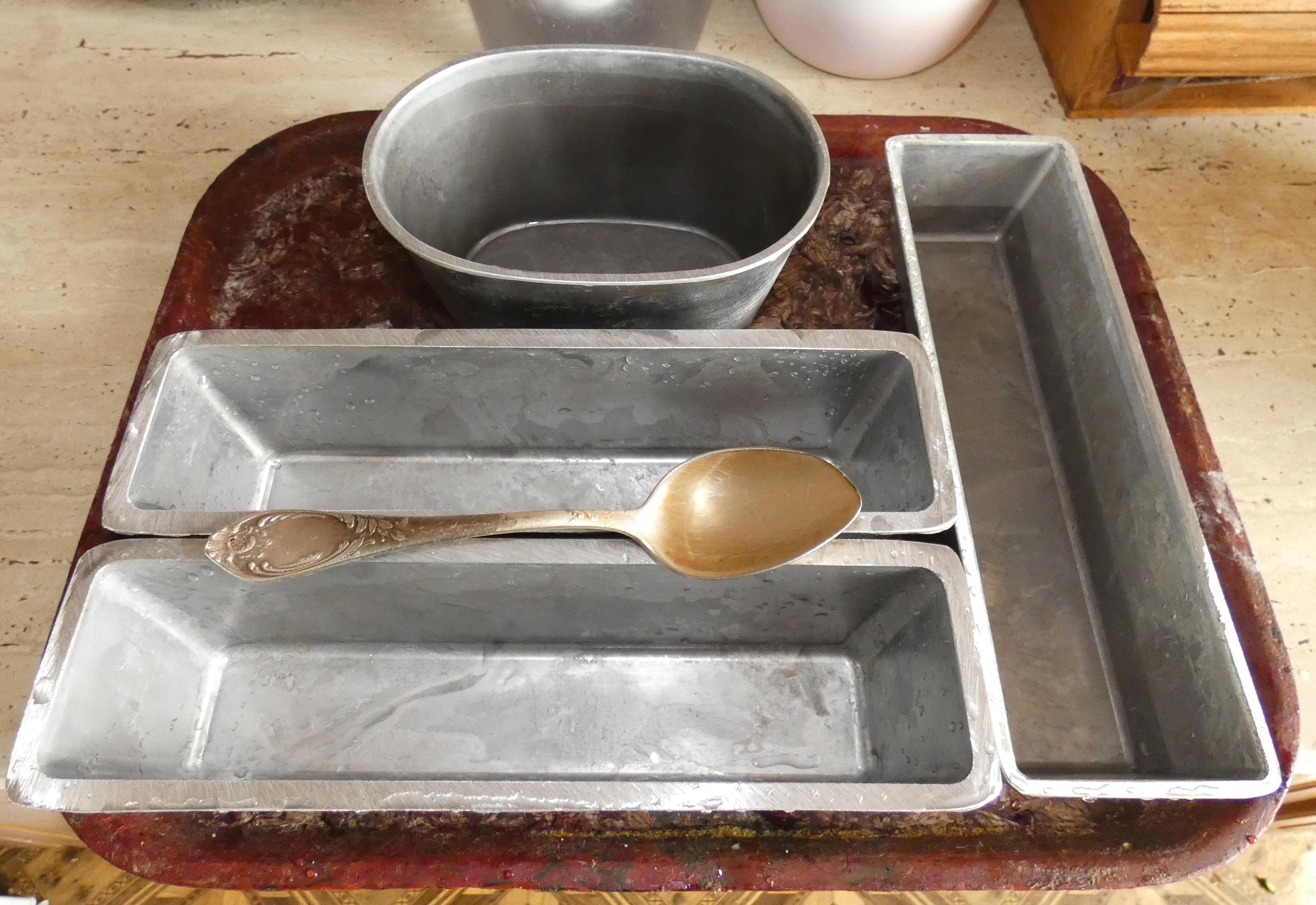 Руки предварительно вымывал, смазывал растительным маслом, и начинал месить. Делать это рекомендуется нижней частью ладони, но я, из-за застарелых травм, неспособен на подобные изгибы, потому мешу кулаком. По рецепту, хлебное тесто нужно месить семь минут. Для советских трёхкопеечных булочек - целых двадцать... Замешанное тесто оставляю на час-полтора для расстойки, потом обминаю, ещё разок вымешиваю, распределяю по формам - и в разогретую духовку примерно на час. Формы у меня разные: классические квадратные для буханок-"кирпичиков", полуовальная для "английских буханок", пара "тостовых" - для маленьких продолговатых буханочек, ещё одна такая же, но - с более низкими бортами...
