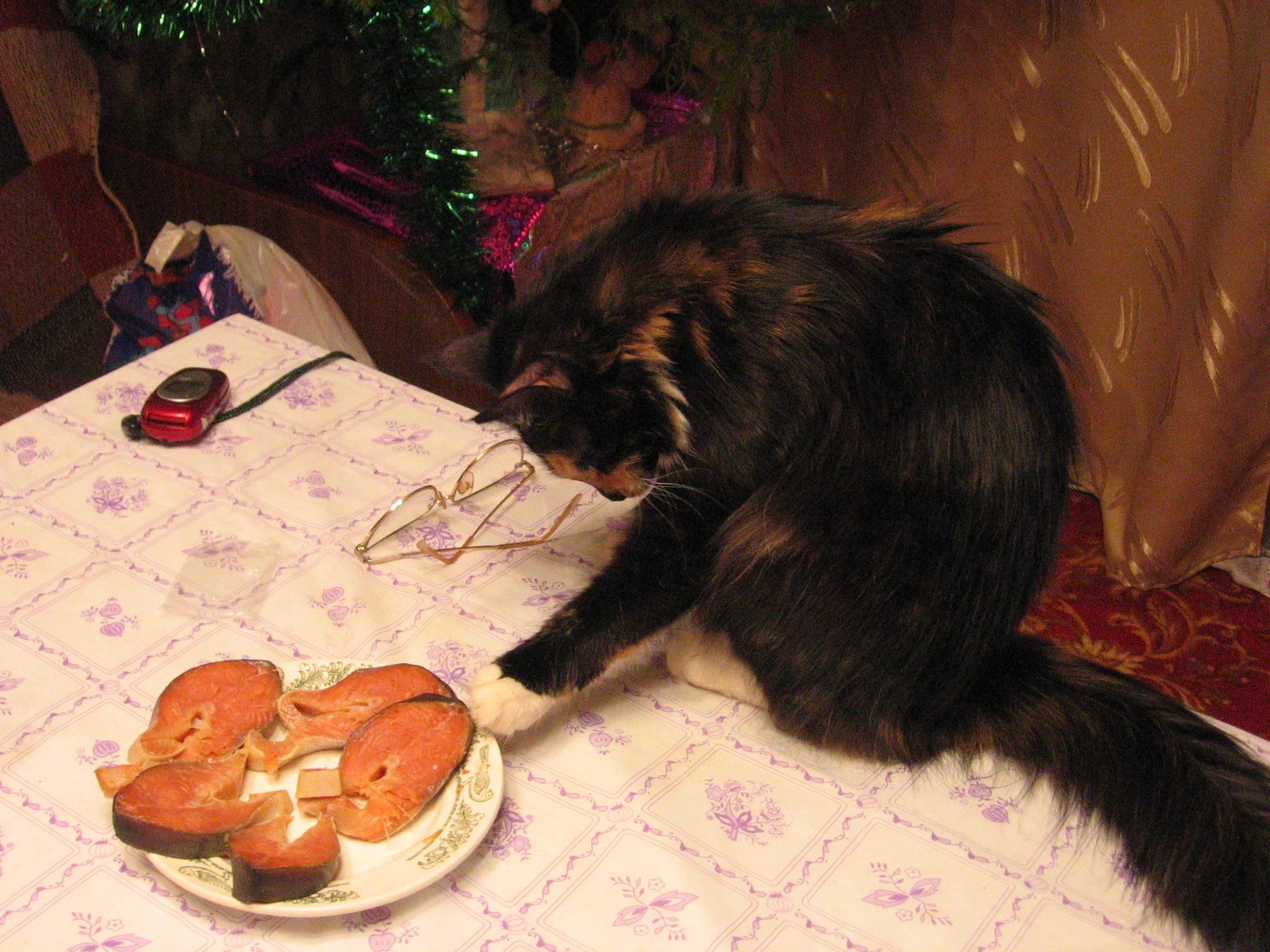 2. Кошечка Лиска под новый год проверяет, правильно ли нарезана красная рыбка: