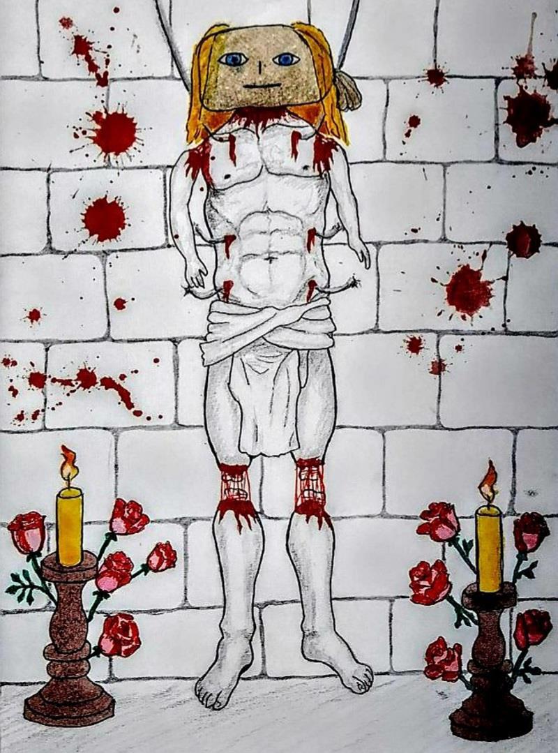 Ко второй работе, которая попала в топ, стараний было приложено меньше - по крайней мере, ее не пришлось рисовать целых три раза, - но за нее голосовали, потому что руки и ноги были на месте. Вернее, их вообще не было, это погрудный портрет.