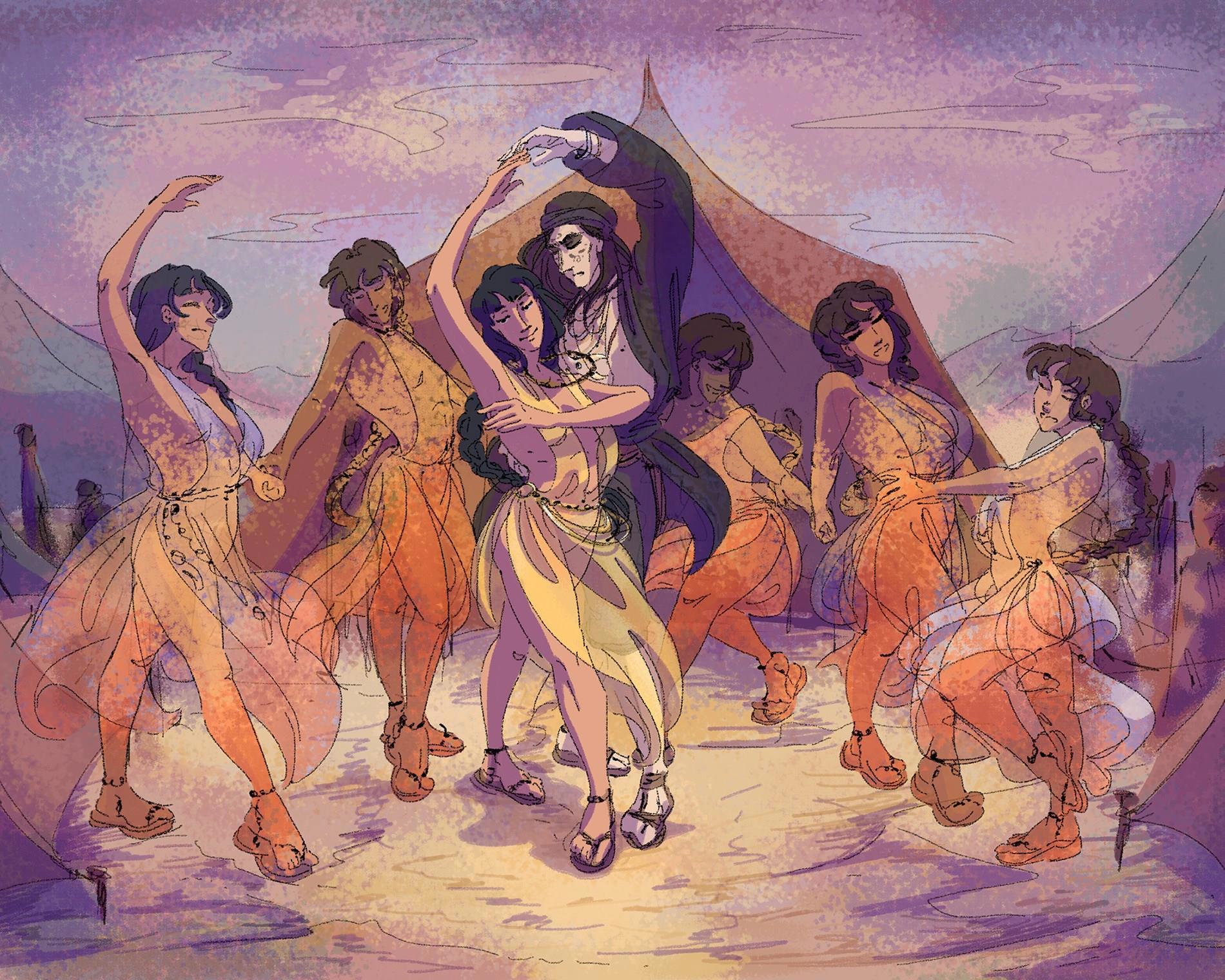 Я восхищена тем, как изображён этот момент. Реально здесь присутствует только Нуру, вот эта девушка по центру. Все остальные есть только в её воспоминаниях, и воспоминания придают ей силы, потому что прямо сейчас Нуру спасает свою жизнь. Это вовсе не весёлый танец.