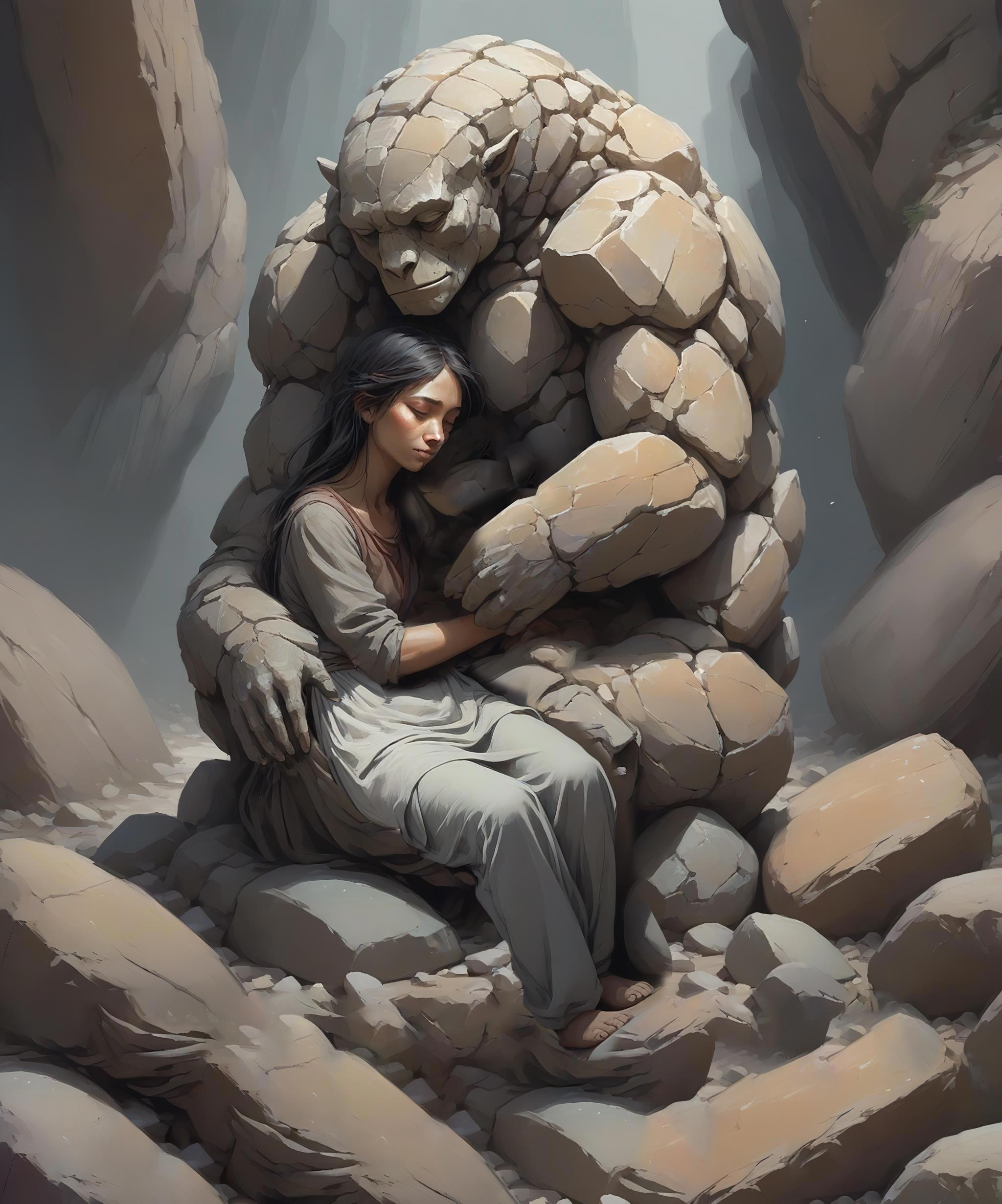 Трогательные иллюстрации в технике коллажа для меня сделала Екатерина Белозерова. Здесь изображены каменный человек и Нуру — и та самая красная антилопа, на рогах которой после дождя распускаются белые цветы. Мне особенно нравится антилопа, эта работа напоминает фреску. Сафир чуть отличается от моих представлений, всё же он был человеком, но общая атмосфера хороша, и уставшая от забот Нуру идеально попала в образ.