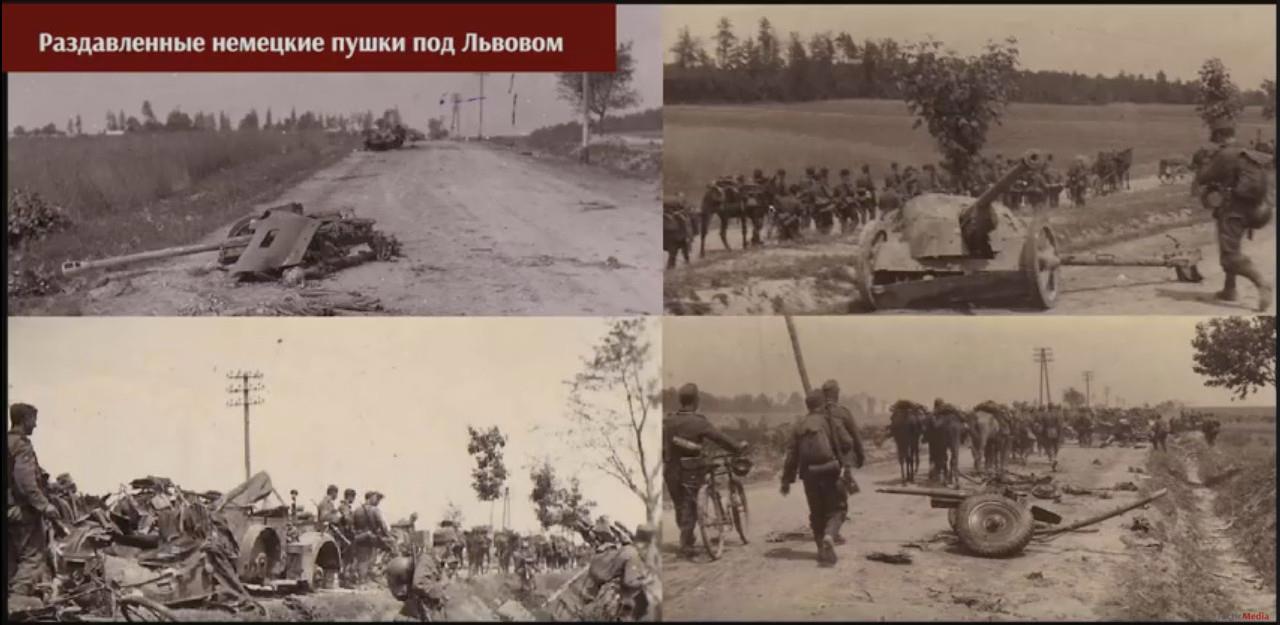 Конечно, немцы тогда побеждали и территория оставалась за ними, поэтому очень много фотографий нашей разбитой техники. Но сами враги делали фотографии, на которых видны результаты яростных атак наших войск. Например, вот на этих фотографиях видны раздавленные советскими танками немецкие противотанковые орудия. Это результат контрудара под Львовом 4 механизированного корпуса Власова. За каждым кадром чей-то подвиг.