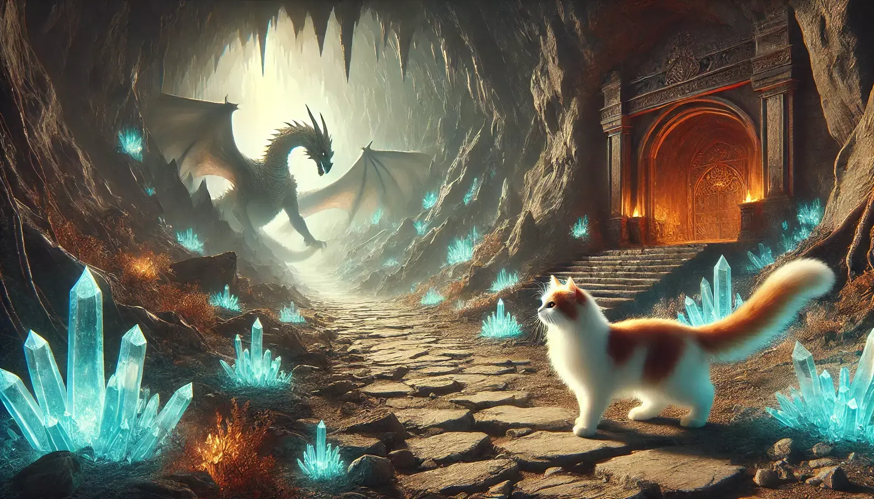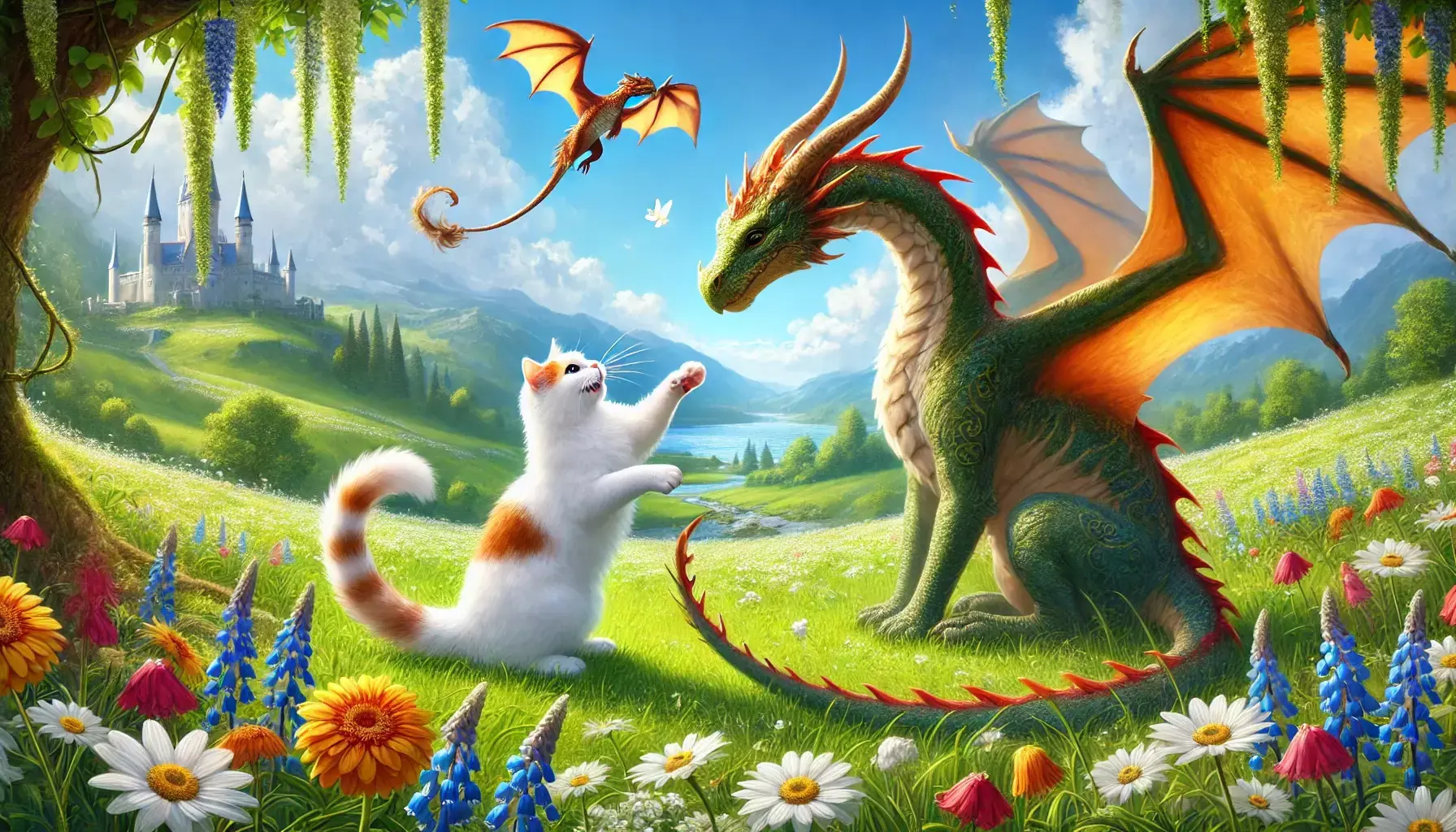 Второй кот осторожно подходит к дракону и гладит его по голове