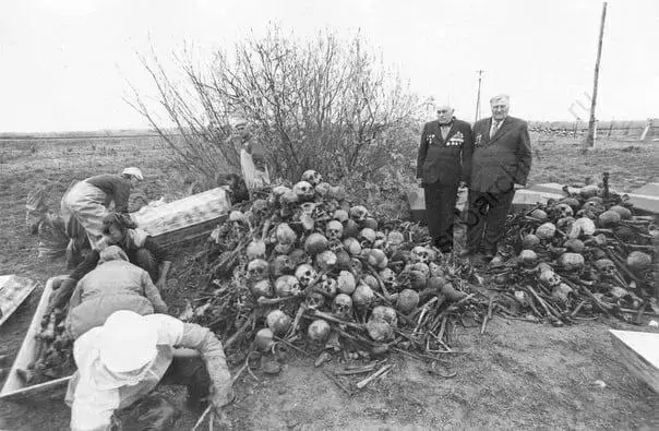 Ветераны 2-й ударной армии И. Беликов (стоит слева) и Н.Ф. Путин (стоит справа) наблюдают за подготовкой к погребению найденных на месте проведения поисковых работ останков красноармейцев.
