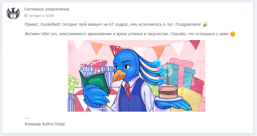 Ну а теперь перейдём ко 2 новости. Сегодня моему аккаунта на АТ стукнуло 6 лет, с чем меня любезно поздравило системное уведомление.