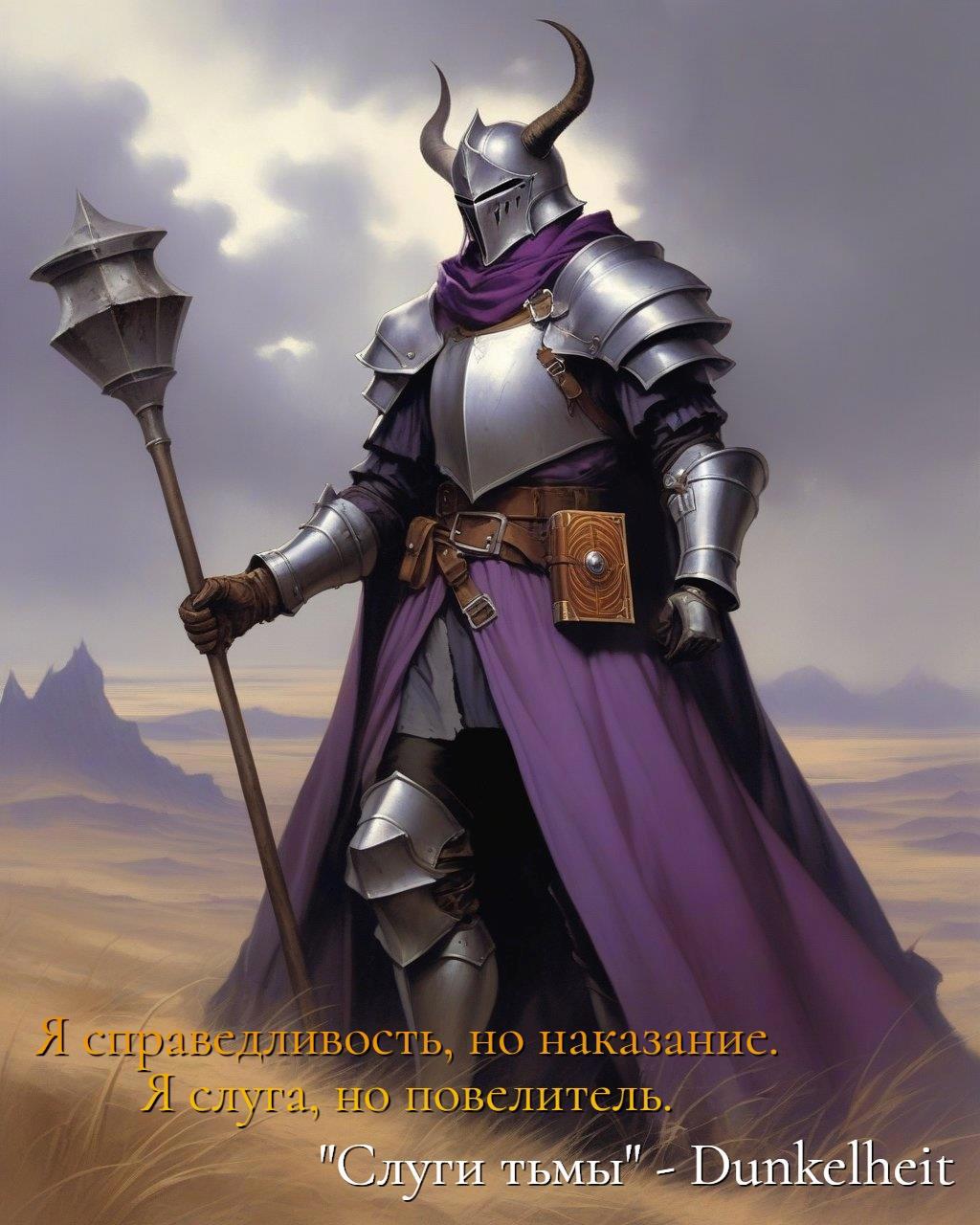 Второй чужак, чей облик внушал ещё больший страх, чем первый, едва походил на человека. Его броня, серая, как могильная пыль, пугающе мерцала в свете факелов. Мощный торс воина был закован в латы, обмотанные толстыми цепями, словно сдерживающими рвущуюся наружу тёмную силу, способную уничтожить всё живое. За спиной развевался истлевший пурпурный плащ с высоким воротником, будто позаимствованный у мёртвого короля. Лицо скрывал шлем с изогнутыми кверху рогами, напоминающими корону падшего ангела, низвергнутого в бездну за свои грехи.