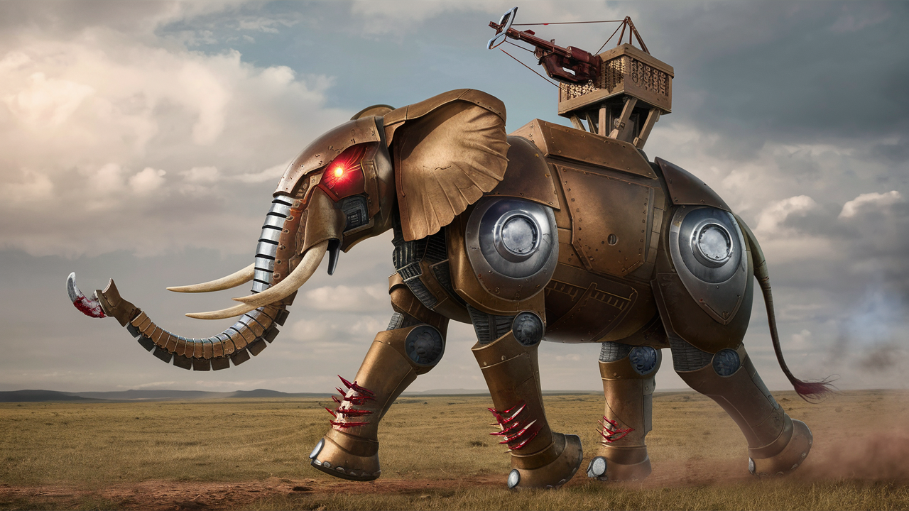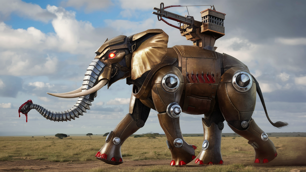Что изменилось: изначальное окружение в виде саванны сменилось полем боя, что, видимо, убедило нейронку накинуть на слона прямо-таки чудесную броню; затем термин "робот" был изменён на более архаичный "автоматон", а для увеличения монументальности слона я стал пользоваться имперскими мерами исчисления, потому что нейронка понимает футы гораздо лучше, чем метры; надстройка на спине всё щё удручает, но всё равно гораздо лучше, чем у предыдущих вариантов, я исключил из её описания термин "римская", заменив на "осадную", и стало более чем гармонично.