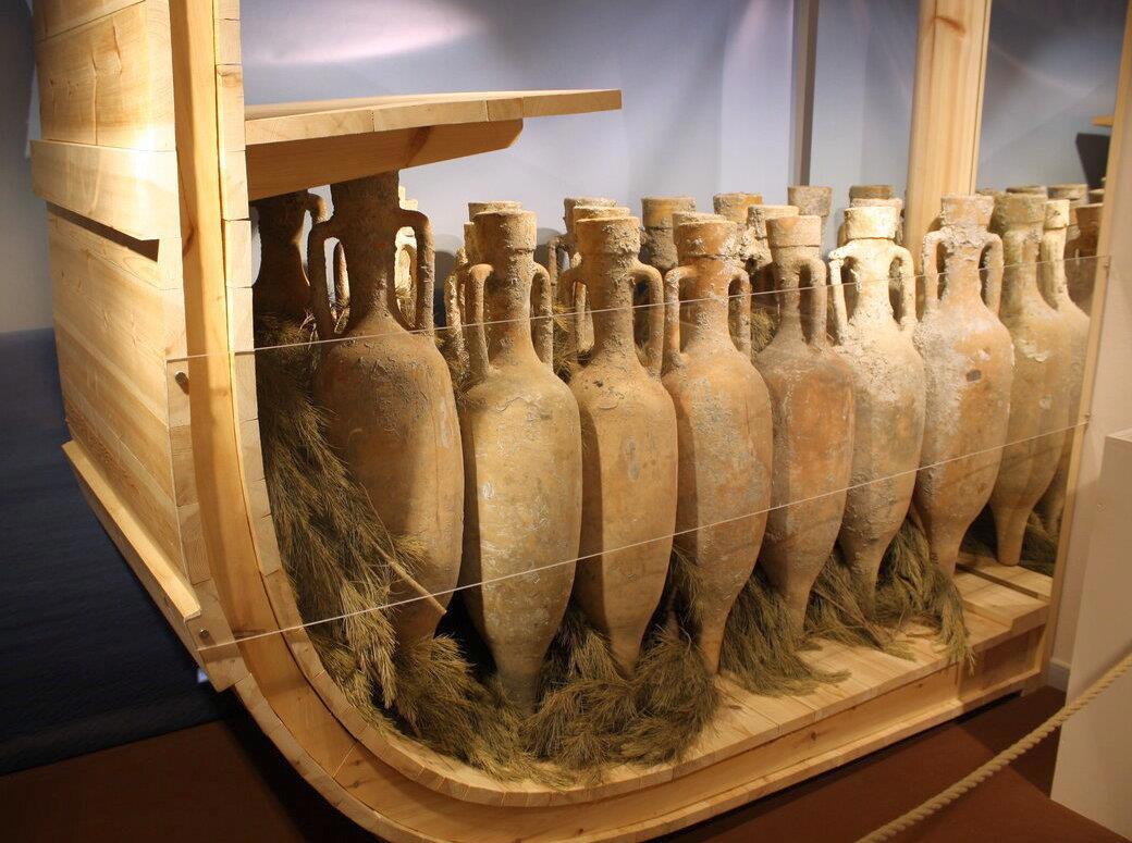 Итак, эти горшки использовались для хранения и транспортировки жидких и сыпучих грузов в основном. Дело в том, что их на самом деле делали все, кому не лень. То есть горшок с условным названием «амфора» могли слепить не только по всем берегам средиземного моря, но и на Чёрном море, и в Индии. Разная форма, разные размеры. Однако были и схожие черты. Например, у подавляющего количества таких сосудов (настоящих, а не гламурных подделок, которые можно встретить в музеях и у частных коллекционеров) ручки не выступали за габариты горшка. Это было практично – при транспортировке их труднее отколоть. Ведь лежали, точнее стояли они на судах примерно вот так: