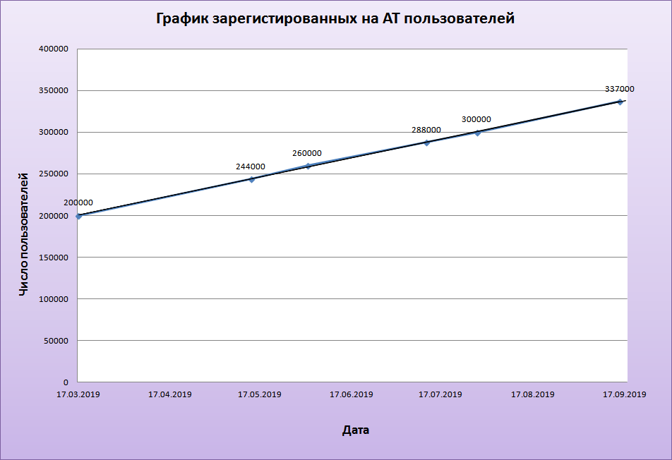 Традиционный график числа пользователей на АТ. На 15.09.2019 было зарегистрировано 337 250 пользователей: