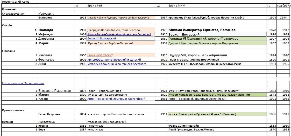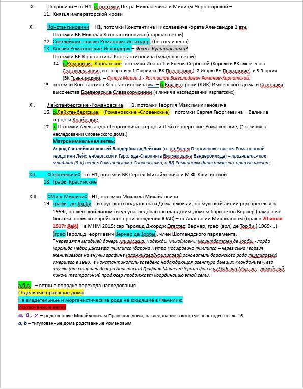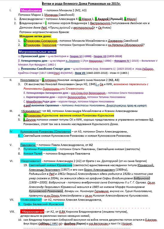 2. В части Романовых в МНМ не было Алапаевских мучеников и других расстрелянных и погибших в РеИ, но были другие погибшие и повешенные. А значит изменились и потомки и очереди наследования. На 2015г в МНМ ветви дома Романовых выглядят так:
