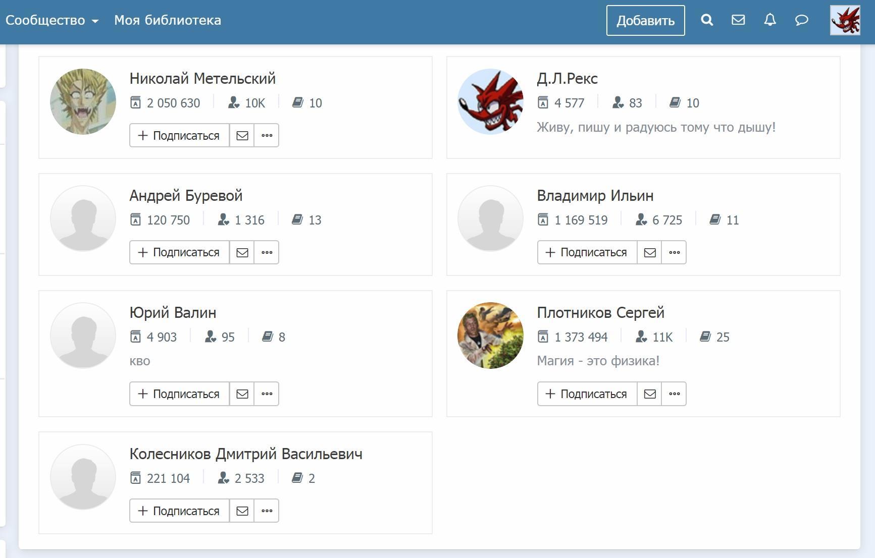 Автор: Д.Л.РексЗашёл сегодня к человеку на меня подписавшемуся. Был в шоке! Среди таких маститых авторов нахожусь!