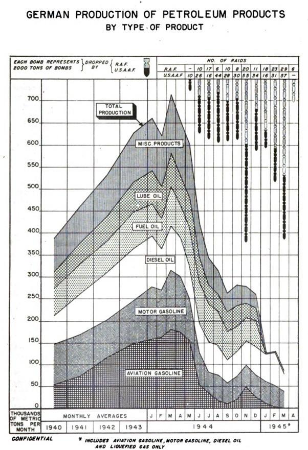 Автор: enfant terribleПопался любопытный график, демонстрирующий результат бомбардировок англичанами и американцами нефтеперерабатывающих заводов в Германии, Румынии и Австрии во времена Второй мировой войны.
