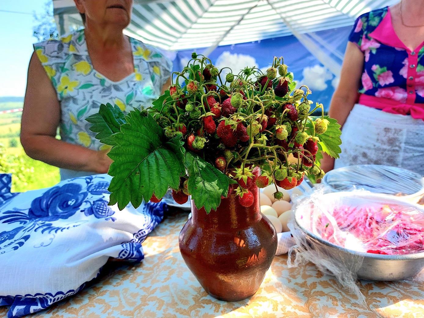 Здесь высоко над селом шумит своими ветвями на ветру большая роща белоствольных берёз, а из мягкой травушки и клевера доносится запах распаренной на солнце дикой земляники.