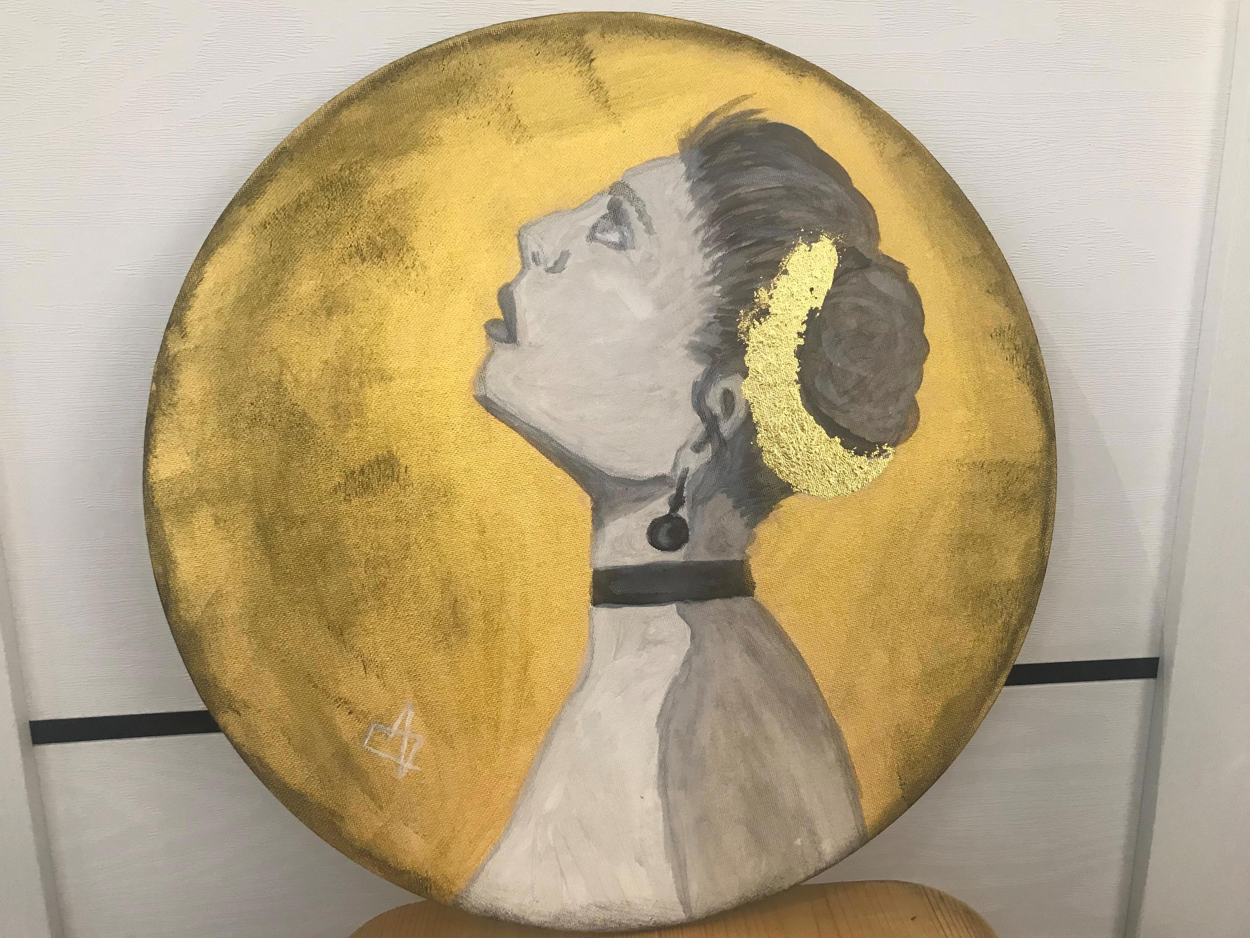 Несколько дней назад я на нескольких своих площадках запустила аукцион. Участвовал один единственный лот, картина девушки написанная мной акрилом и поталью)