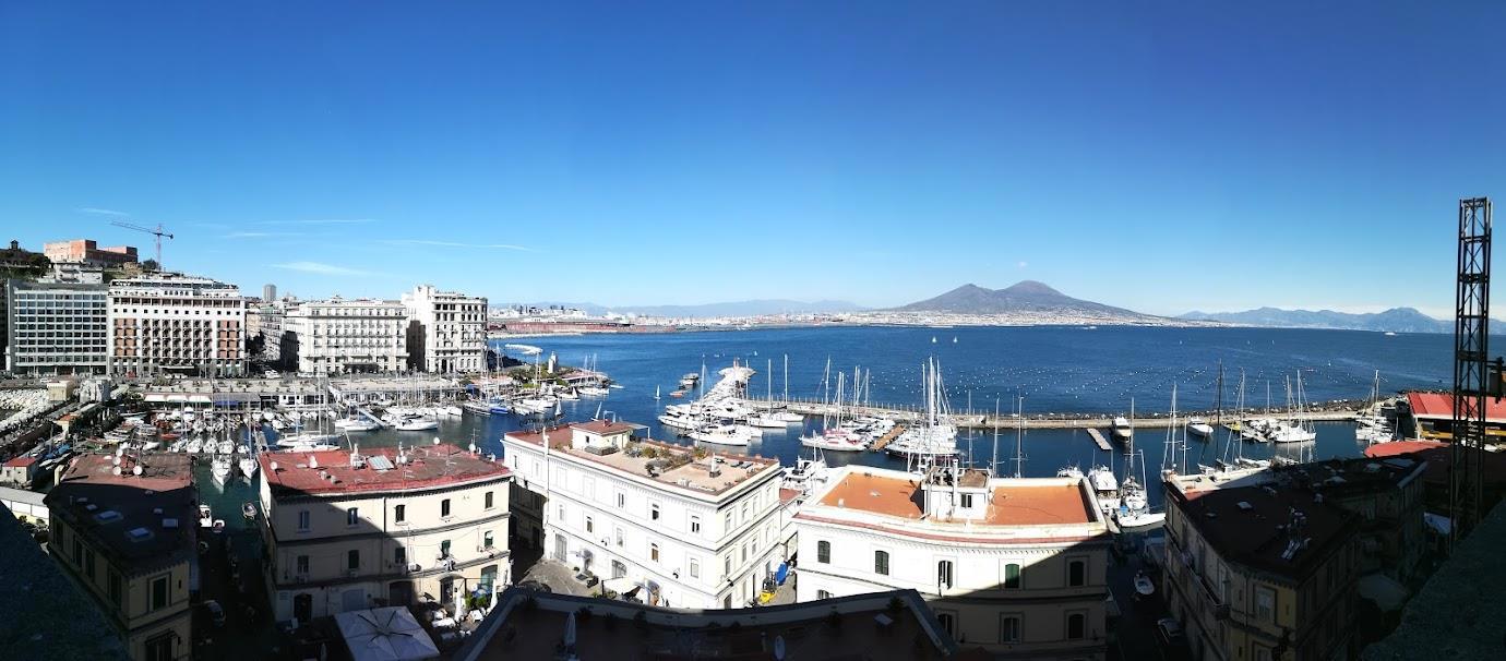 Вид на Везувий. Там под ним Помпеи, откуда мы приехали на электричке. Кстати это панорама, снятая на смартфон с рук, когда ведёшь им из стороны в сторону, а он делает несколько кадров, а потом их соединяет в это: