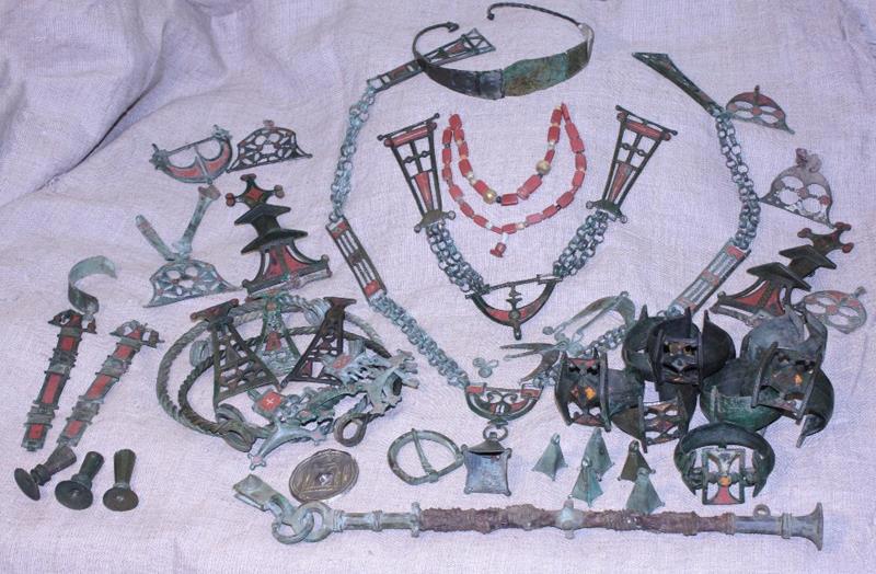 Клад состоит ~ из 180 предметов, многие из них украшены яркими вставками красной и оранжевой эмали. Это бронзовые браслеты, лунницы (подвески), нагрудные цепи с подвесками, фибулы, навершия ритонов (сосуды для питья), головные венчики, стеклянное ожерелье.