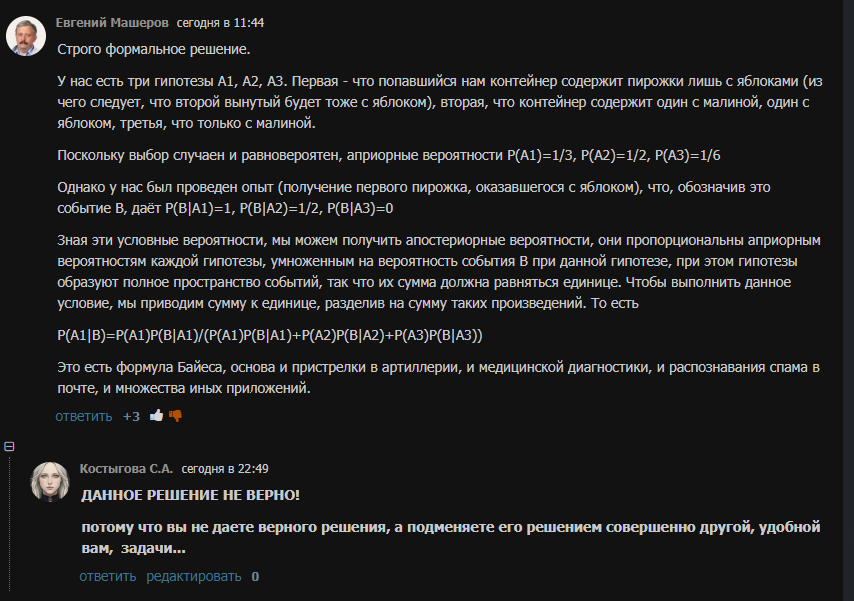 его решение отвечает на вопрос: какова вероятность того что взятый пирожок из контейнеров где есть яблоки будет с яблоком? просто взятый, а не второй по очереди. то есть человек решил (хоть и правильно), но совершенно принципиально ДРУГУЮ задачу.