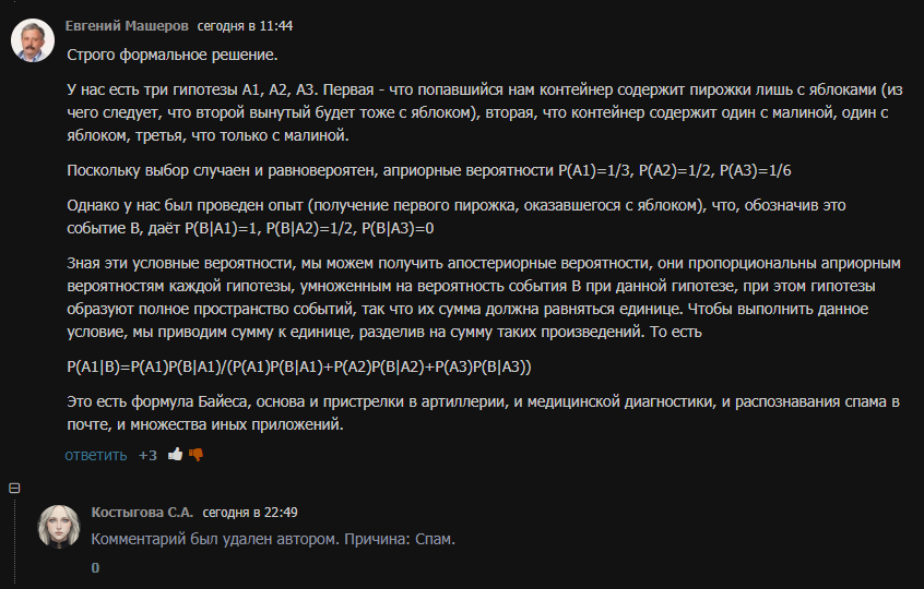 после того как мы в случайно выбранном контейнере взяли в руки один из пирожков и выяснилось что он с яблоком, контейнер с 2мя пирожками с малиной покидает выборку! - тк это точно не он! в итоге у нас один пирожок заявлен как 100% с яблоком и массив выборки теперь выглядит так: