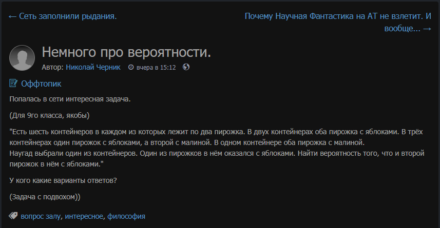 Автор: Костыгова Светланая по образованию - инженер. не могу сказать что "тервер" был всегда моей самой сильной стороной, но взять школьную задачку, приложить к ней школьные же формулы и методы решения я всё же способна. (да, я так же полагаю что школьная задачка должна решаться школьными методами, а не институтскими!) но тут возник ньюанс...