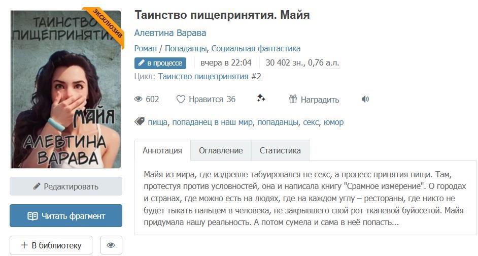 Автор: Алевтина ВараваНикаких предрассудков, правил и ограничений в сексе, но взамен - жёсткая система табу, связанных с потреблением пищи! Это - параллельный мир, в который случайно угодила героиня Алиса. И вот пока она там в первом томе приключалась, героиня Майя оттуда оказалась в нашей реальности. Именно о её похождениях в привычном нам Волгограде - второй том цикла "Таинство пищепринятия". Как проведёт лето дипломированная проститутка и автор книги "Срамное измерение" в реалиях, где на каждом шагу голые рты, - можно почитать здесь: