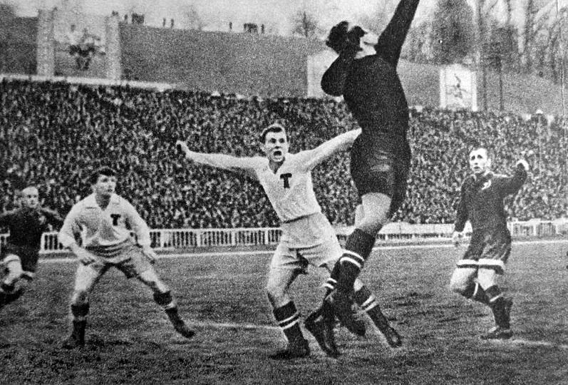 В самом начале второго тайма арбитр фиксирует игру рукой у наших ворот. Одиннадцатиметровый. Наш пока ещё не звёздный Яшин угадывает направление удара Боброва и отбивает мяч вверх к "точке". Сева с лёта коряво посылает круглого в другой угол. Наш голкипер, словно презрев законы гравитации, пружинит к другой штанге и в воздухе переводит мяч на угловой. Такие цирковые трюки в исполнении Льва Яшина ещё лет двадцать будут приводить соперников и трибуны в неистовство...
