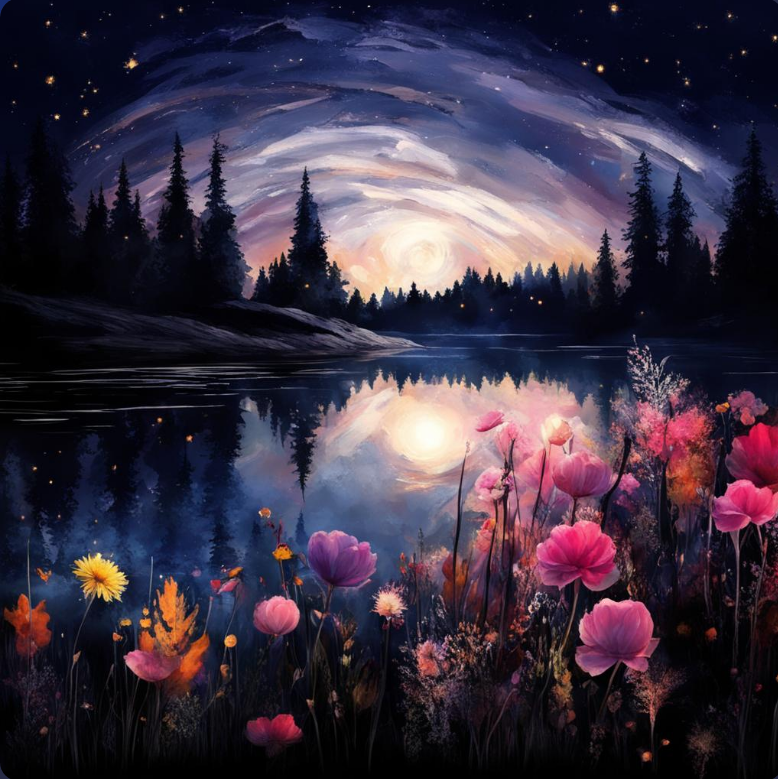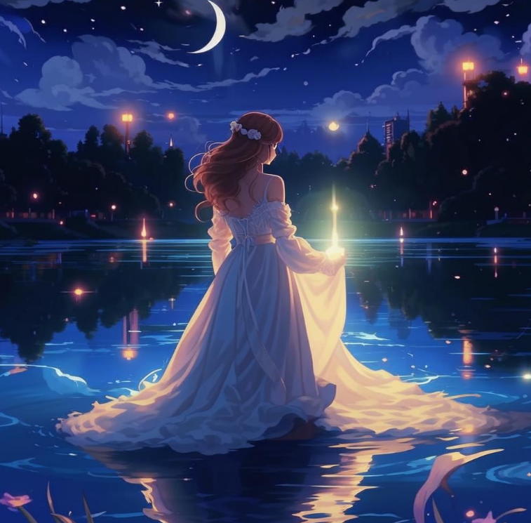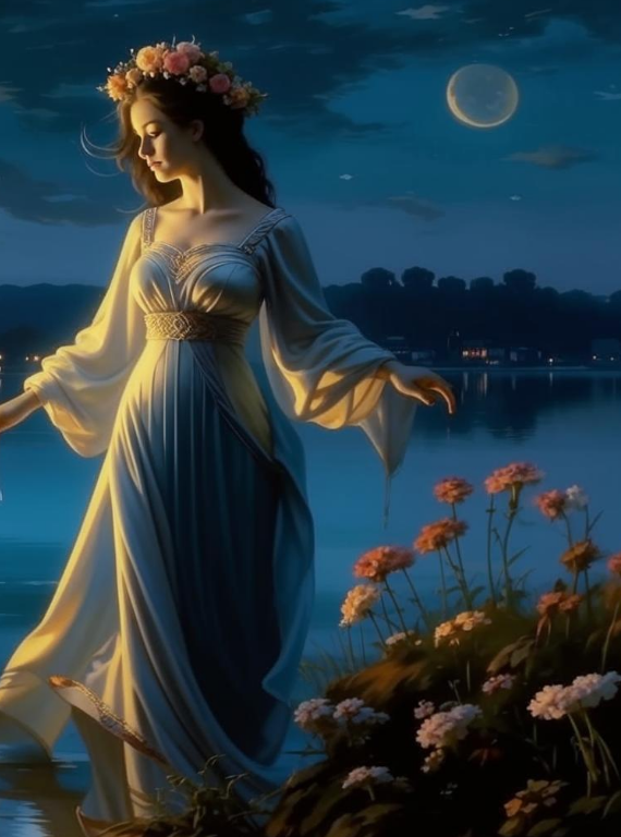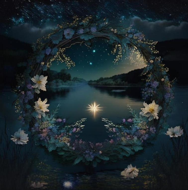 Кто бы она ни была, ведунья протащила их под огромной круглой аркой, сплетённой из цветов. Проводница растворилась в танце теней, а Василиса увидела впереди тёмную воду широкого ручья. В черноте воды посвёркивали искры лунного света, резко очерчивающие рисунки венков, медленно плывущих по ручью.