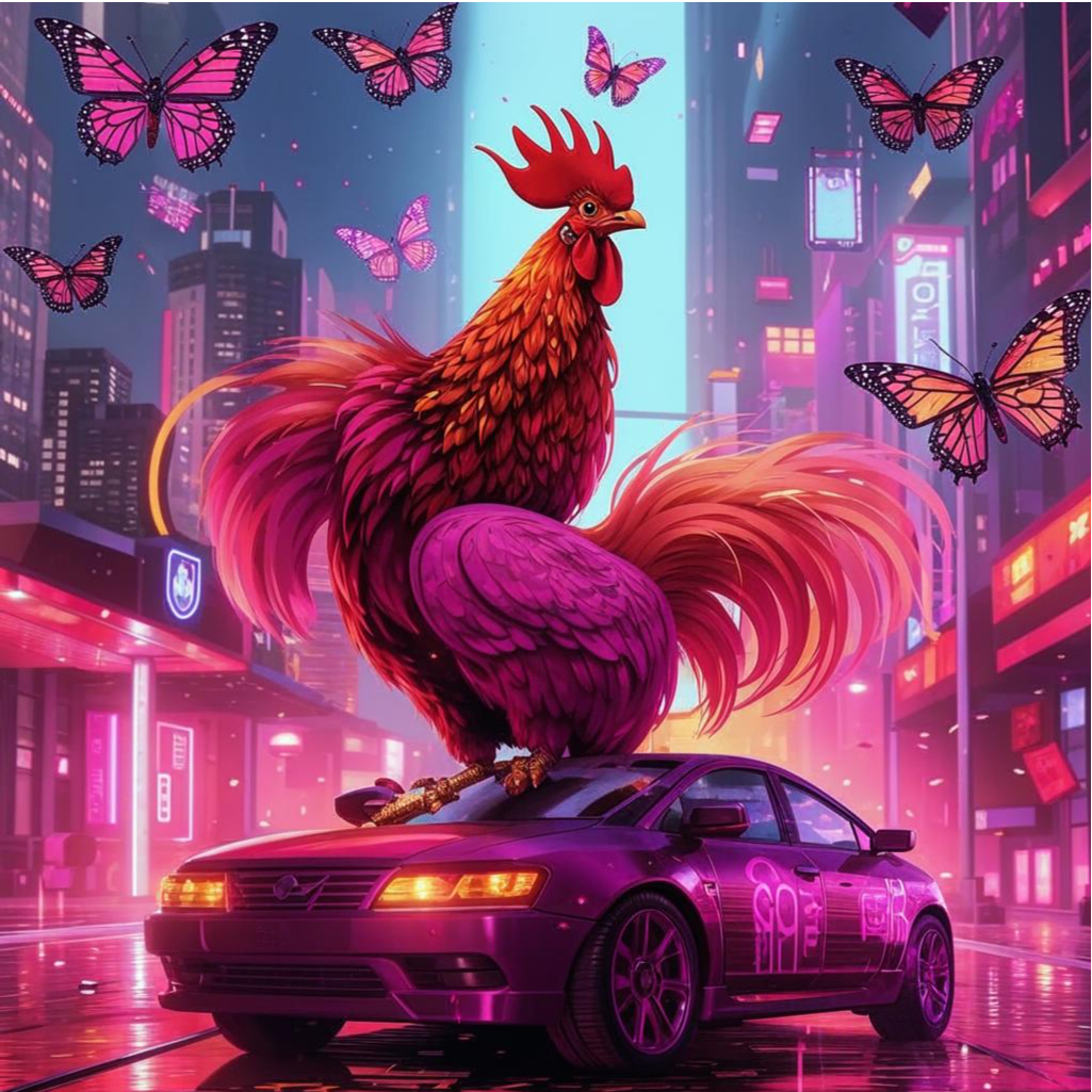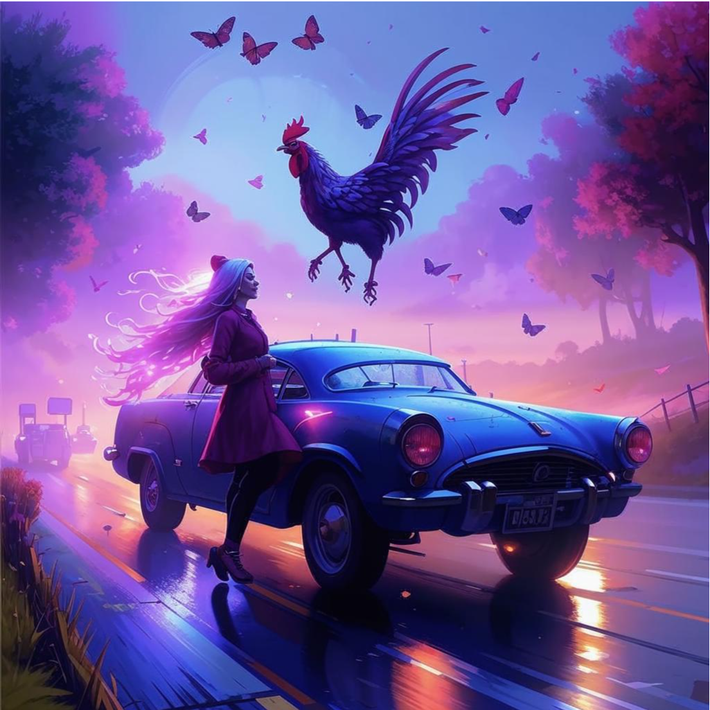 ...а на двенадцатой картинке огромный петух-мутант пытается раздавить чьё-то авто...