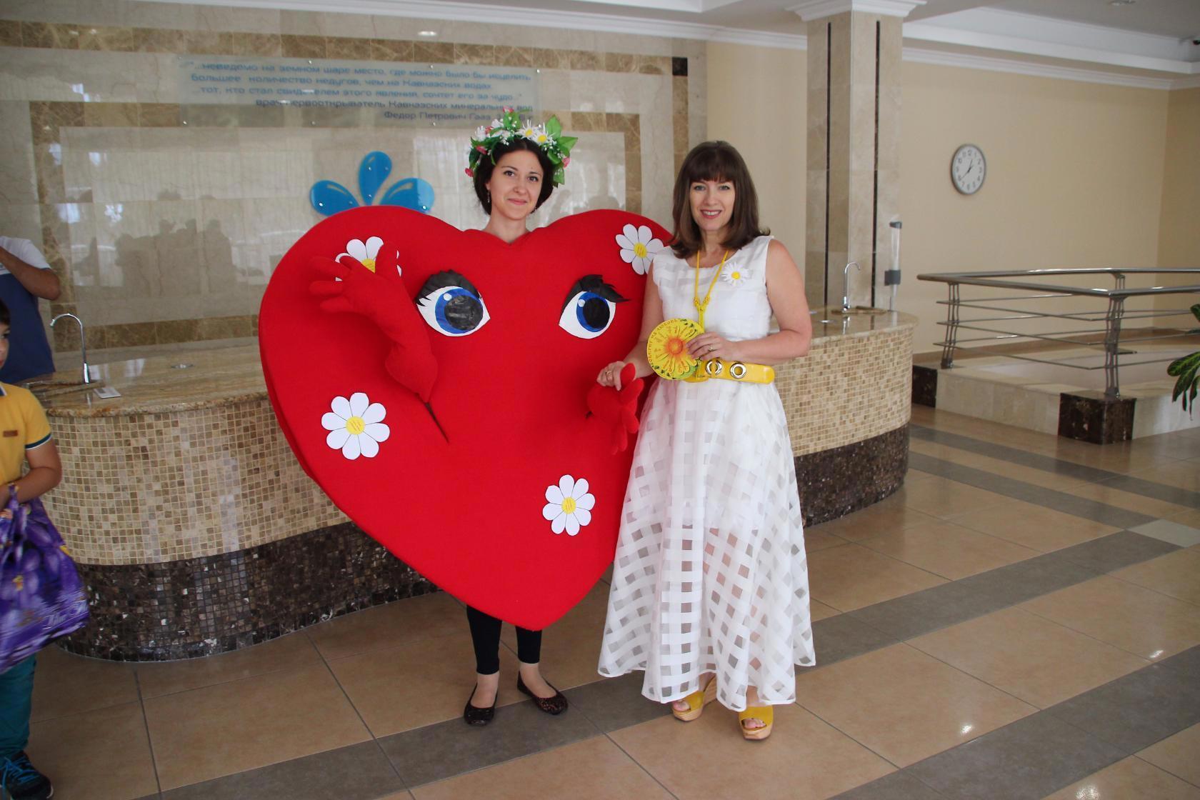 Чтобы праздник был красочнее, я нарядила аниматора службы в большое красное сердце, усыпанное ромашками. Сердце ходило в районе бювета с небольшой корзиночкой и любой желающий мог взять оттуда красивое пожелание или высказывание о любви классиков. И, конечно, с ним с радостью фотографировались.