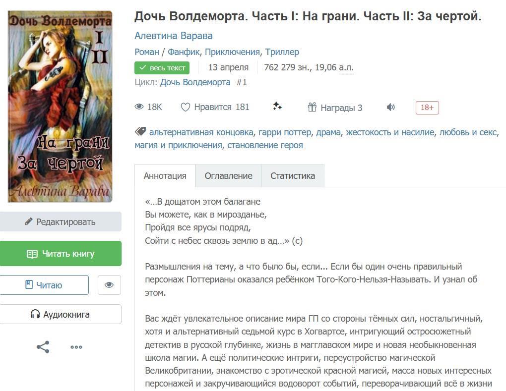 Автор: Алевтина ВараваВас ждёт увлекательное описание мира ГП со стороны тёмных сил, ностальгичный, хотя и альтернативный седьмой курс в Хогвартсе, интригующий остросюжетный детектив в русской глубинке, жизнь в магглавском мире и новая необыкновенная школа магии. А ещё политические интриги, переустройство магической Великобритании, знакомство с эротической красной магией, масса новых интересных персонажей и закручивающийся водоворот событий, переворачивающий всё в жизни ГГ. Многократно.